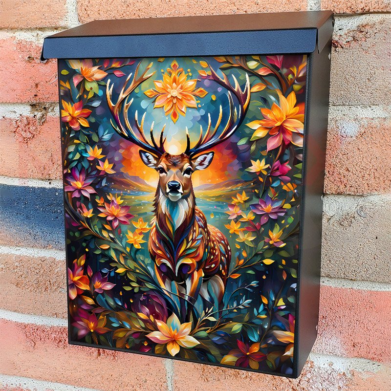 With this Bohemian Springtime Deer colonial mailbox cover it’s pretty easy to convert your mailbox to a special and unique item. These covers require a flat surface, so they work with colonial mailboxes that do not have any embossed decoration or signs. Magnetic mailbox covers work with steel colonial boxes only, while self-adhesive vinyl covers are available for aluminum, plastic and steel boxes. We also offer both self-adhesive and magnetic covers with regular opaque white vinyl or reflective vinyl, which works similarly to license plates or road signs. The reflective option makes the entire cover’s surface reflective, ensuring visibility at night. In case your mailbox doesn’t work with these covers, you can purchase the preinstalled cover on a brand new mailbox as well. Also, you can create your custom colonial mailbox cover using you own pictures, adding your name, street number, etc.