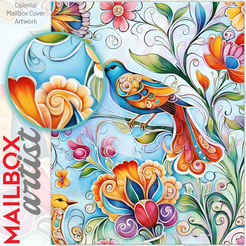 With this Boho Flowers and Birds colonial mailbox cover it’s pretty easy to convert your mailbox to a special and unique item. These covers require a flat surface, so they work with colonial mailboxes that do not have any embossed decoration or signs. Magnetic mailbox covers work with steel colonial boxes only, while self-adhesive vinyl covers are available for aluminum, plastic and steel boxes. We also offer both self-adhesive and magnetic covers with regular opaque white vinyl or reflective vinyl, which works similarly to license plates or road signs. The reflective option makes the entire cover’s surface reflective, ensuring visibility at night. In case your mailbox doesn’t work with these covers, you can purchase the preinstalled cover on a brand new mailbox as well. Also, you can create your custom colonial mailbox cover using you own pictures, adding your name, street number, etc.