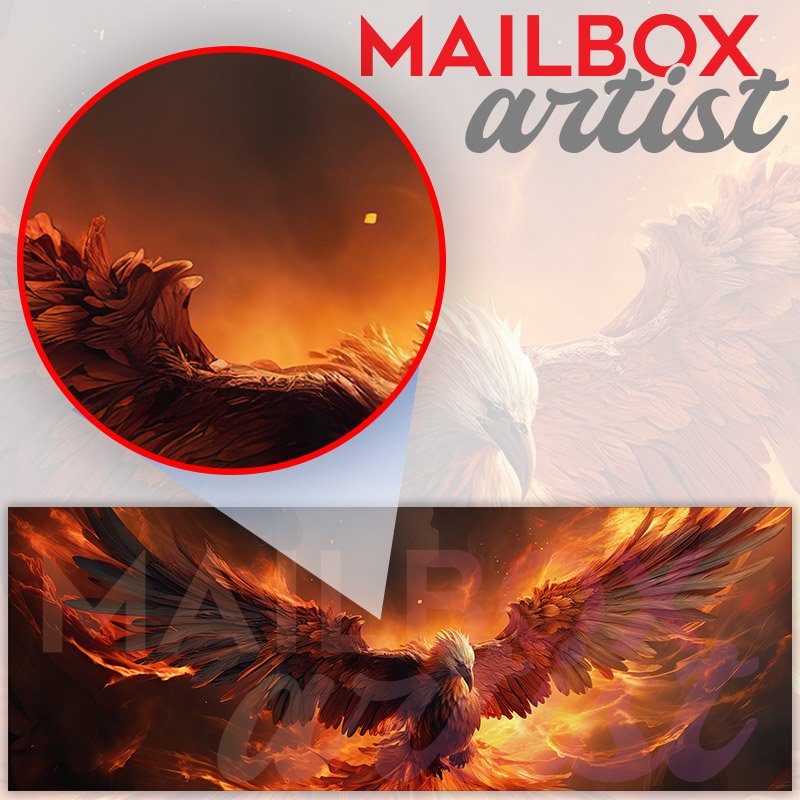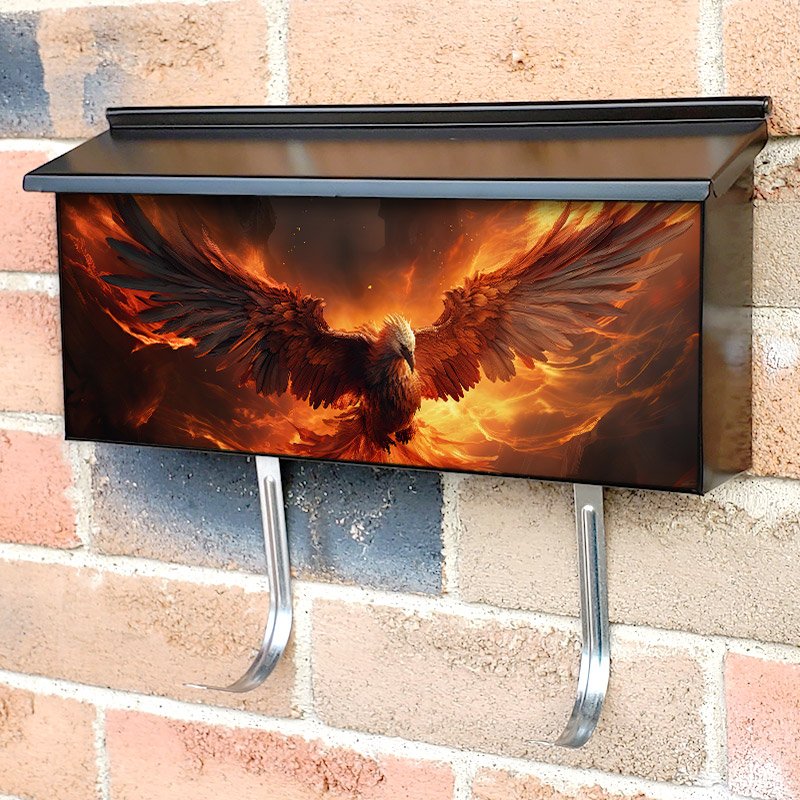 Applying your Burning Phoenix Bird On Black townhouse / ranch mailbox cover it’s pretty easy to convert your mailbox to a special and unique item. These covers require a flat surface, so they work with townhouse / ranch mailboxes that do not have any embossed decoration or signs. Magnetic mailbox covers work with steel boxes, for aluminum and plastic boxes we offer the self-adhesive vinyl covers. In case your mailbox doesn’t work with these covers, you can purchase the preinstalled cover on a brand new mailbox as well. Also, you can create your custom townhouse / ranch mailbox cover using you own pictures, adding your name, street number, etc.