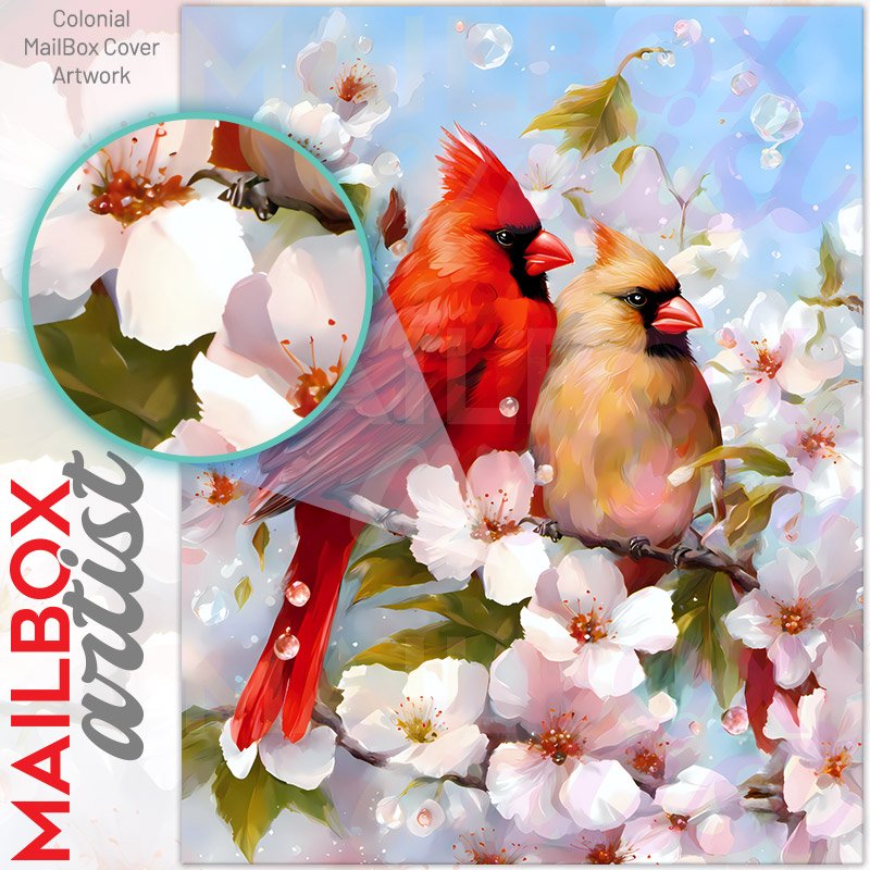 With this Cardinal Couple on a Blooming Cherry Tree colonial mailbox cover it’s pretty easy to convert your mailbox to a special and unique item. These covers require a flat surface, so they work with colonial mailboxes that do not have any embossed decoration or signs. Magnetic mailbox covers work with steel colonial boxes only, while self-adhesive vinyl covers are available for aluminum, plastic and steel boxes. We also offer both self-adhesive and magnetic covers with regular opaque white vinyl or reflective vinyl, which works similarly to license plates or road signs. The reflective option makes the entire cover’s surface reflective, ensuring visibility at night. In case your mailbox doesn’t work with these covers, you can purchase the preinstalled cover on a brand new mailbox as well. Also, you can create your custom colonial mailbox cover using you own pictures, adding your name, street number, etc.
