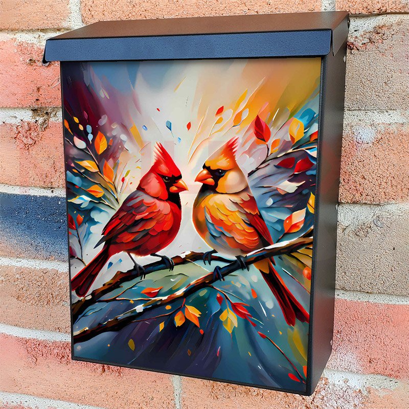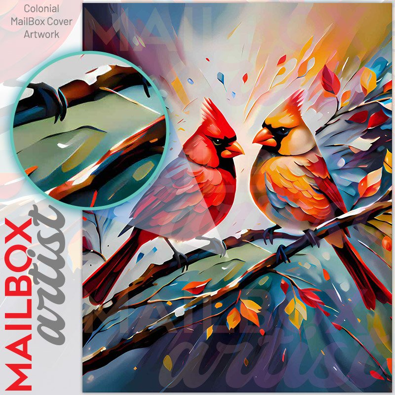 With this Cardinal Couple on the Tree colonial mailbox cover it’s pretty easy to convert your mailbox to a special and unique item. These covers require a flat surface, so they work with colonial mailboxes that do not have any embossed decoration or signs. Magnetic mailbox covers work with steel colonial boxes only, while self-adhesive vinyl covers are available for aluminum, plastic and steel boxes. We also offer both self-adhesive and magnetic covers with regular opaque white vinyl or reflective vinyl, which works similarly to license plates or road signs. The reflective option makes the entire cover’s surface reflective, ensuring visibility at night. In case your mailbox doesn’t work with these covers, you can purchase the preinstalled cover on a brand new mailbox as well. Also, you can create your custom colonial mailbox cover using you own pictures, adding your name, street number, etc.