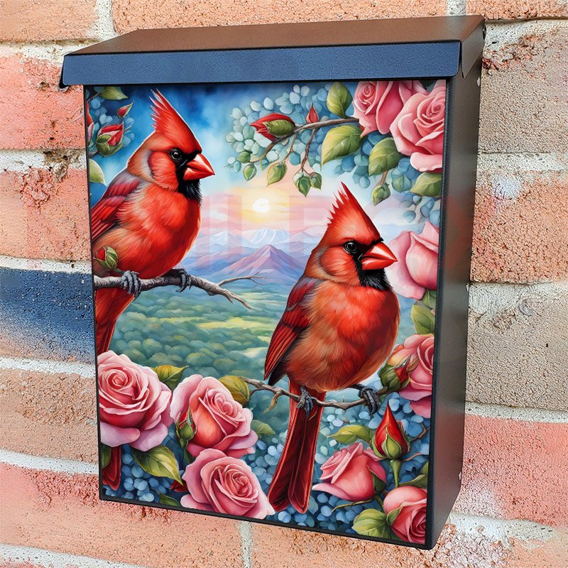 With this Cardinals on the Rose Bush colonial mailbox cover it’s pretty easy to convert your mailbox to a special and unique item. These covers require a flat surface, so they work with colonial mailboxes that do not have any embossed decoration or signs. Magnetic mailbox covers work with steel colonial boxes only, while self-adhesive vinyl covers are available for aluminum, plastic and steel boxes. We also offer both self-adhesive and magnetic covers with regular opaque white vinyl or reflective vinyl, which works similarly to license plates or road signs. The reflective option makes the entire cover’s surface reflective, ensuring visibility at night. In case your mailbox doesn’t work with these covers, you can purchase the preinstalled cover on a brand new mailbox as well. Also, you can create your custom colonial mailbox cover using you own pictures, adding your name, street number, etc.