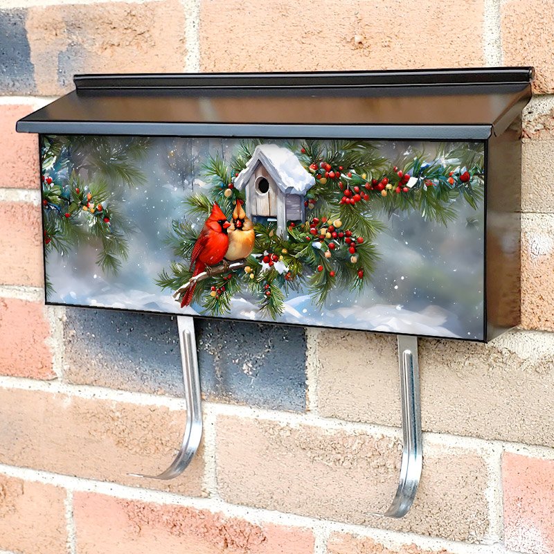 Applying your Christmas Cardinal Couple and Birdhouse townhouse / ranch mailbox cover it’s pretty easy to convert your mailbox to a special and unique item. These covers require a flat surface, so they work with townhouse / ranch mailboxes that do not have any embossed decoration or signs. Magnetic mailbox covers work with steel boxes, for aluminum and plastic boxes we offer the self-adhesive vinyl covers. In case your mailbox doesn’t work with these covers, you can purchase the preinstalled cover on a brand new mailbox as well. Also, you can create your custom townhouse / ranch mailbox cover using you own pictures, adding your name, street number, etc.