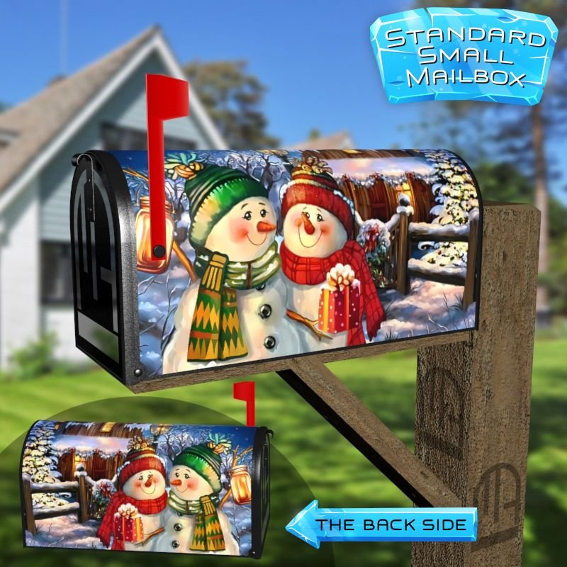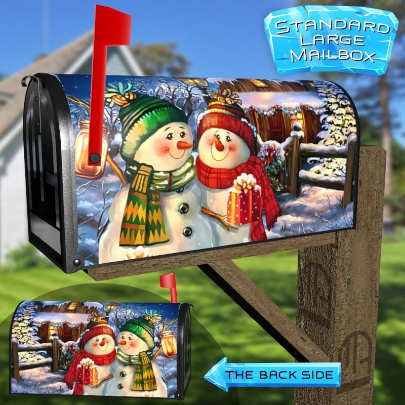 Dressing up your rural farm mailbox with the Christmas Cottage and Snowmen mailbox cover is an easy way to convert it into a unique and special item. These covers require a smooth surface, so they are compatible with rural farm mailboxes that do not have any embossed decorations or signs. Magnetic mailbox covers work with steel boxes only, while self-adhesive vinyl covers are available for aluminum, plastic and steel boxes. If your mailbox is not compatible with these covers, you can purchase a brand new mailbox with a preinstalled cover. Additionally, you have the option to create a custom rural farm mailbox cover with your own pictures, name, street number, etc.