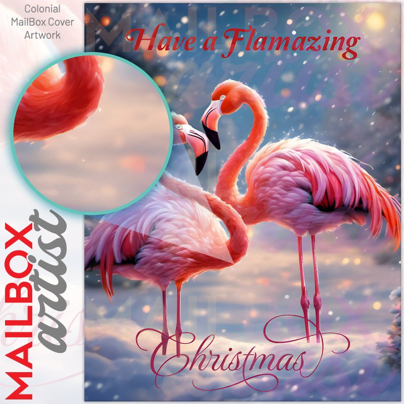 With this Christmas Flamingo Couple colonial mailbox cover it’s pretty easy to convert your mailbox to a special and unique item. These covers require a flat surface, so they work with colonial mailboxes that do not have any embossed decoration or signs. Magnetic mailbox covers work with steel colonial boxes only, while self-adhesive vinyl covers are available for aluminum, plastic and steel boxes. We also offer both self-adhesive and magnetic covers with regular opaque white vinyl or reflective vinyl, which works similarly to license plates or road signs. The reflective option makes the entire cover’s surface reflective, ensuring visibility at night. In case your mailbox doesn’t work with these covers, you can purchase the preinstalled cover on a brand new mailbox as well. Also, you can create your custom colonial mailbox cover using you own pictures, adding your name, street number, etc.