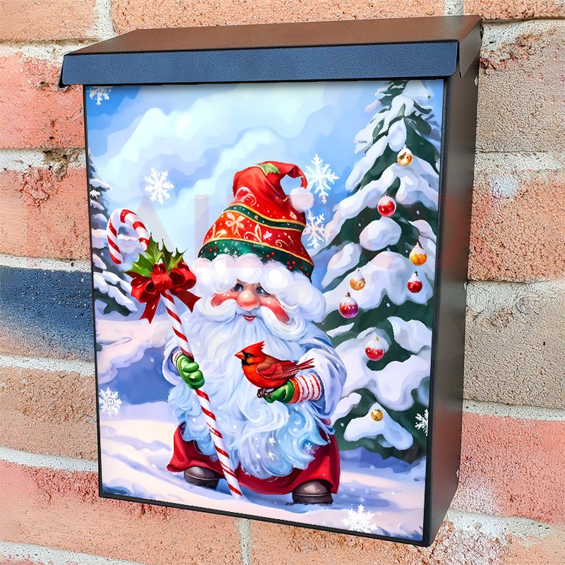 With this Christmas Gnome with a Cardinal 2 colonial mailbox cover it’s pretty easy to convert your mailbox to a special and unique item. These covers require a flat surface, so they work with colonial mailboxes that do not have any embossed decoration or signs. Magnetic mailbox covers work with steel colonial boxes only, while self-adhesive vinyl covers are available for aluminum, plastic and steel boxes. We also offer both self-adhesive and magnetic covers with regular opaque white vinyl or reflective vinyl, which works similarly to license plates or road signs. The reflective option makes the entire cover’s surface reflective, ensuring visibility at night. In case your mailbox doesn’t work with these covers, you can purchase the preinstalled cover on a brand new mailbox as well. Also, you can create your custom colonial mailbox cover using you own pictures, adding your name, street number, etc.