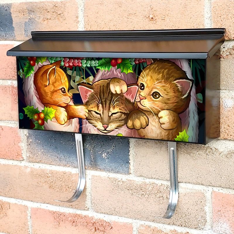 Applying your Christmas Kitten Stockings townhouse / ranch mailbox cover it’s pretty easy to convert your mailbox to a special and unique item. These covers require a flat surface, so they work with townhouse / ranch mailboxes that do not have any embossed decoration or signs. Magnetic mailbox covers work with steel boxes, for aluminum and plastic boxes we offer the self-adhesive vinyl covers. In case your mailbox doesn’t work with these covers, you can purchase the preinstalled cover on a brand new mailbox as well. Also, you can create your custom townhouse / ranch mailbox cover using you own pictures, adding your name, street number, etc.