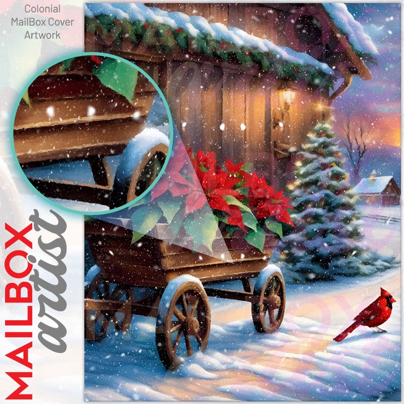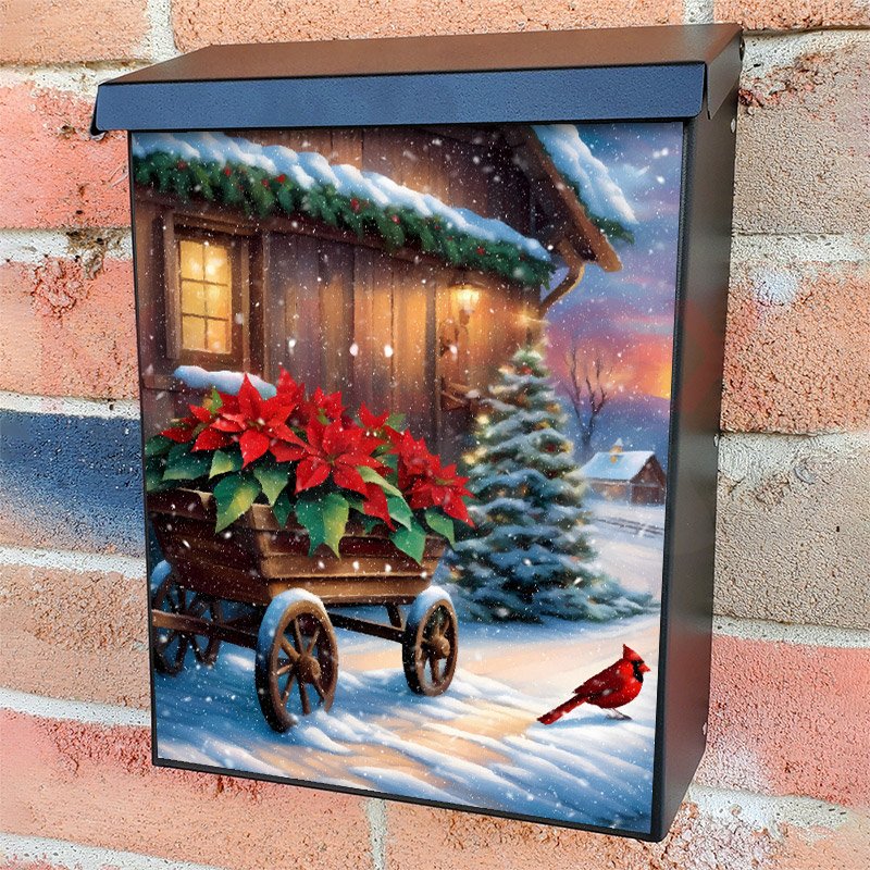 With this Christmas Poinsettia Farmhouse colonial mailbox cover it’s pretty easy to convert your mailbox to a special and unique item. These covers require a flat surface, so they work with colonial mailboxes that do not have any embossed decoration or signs. Magnetic mailbox covers work with steel colonial boxes only, while self-adhesive vinyl covers are available for aluminum, plastic and steel boxes. We also offer both self-adhesive and magnetic covers with regular opaque white vinyl or reflective vinyl, which works similarly to license plates or road signs. The reflective option makes the entire cover’s surface reflective, ensuring visibility at night. In case your mailbox doesn’t work with these covers, you can purchase the preinstalled cover on a brand new mailbox as well. Also, you can create your custom colonial mailbox cover using you own pictures, adding your name, street number, etc.