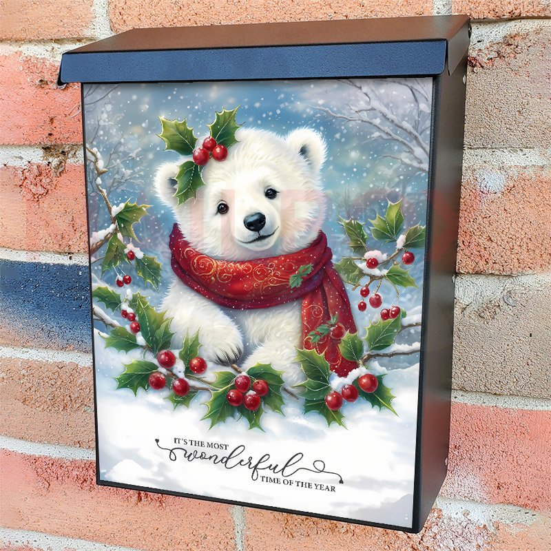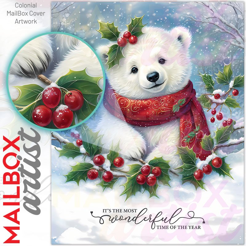 With this Christmas Polar Bear Cub colonial mailbox cover it’s pretty easy to convert your mailbox to a special and unique item. These covers require a flat surface, so they work with colonial mailboxes that do not have any embossed decoration or signs. Magnetic mailbox covers work with steel colonial boxes only, while self-adhesive vinyl covers are available for aluminum, plastic and steel boxes. We also offer both self-adhesive and magnetic covers with regular opaque white vinyl or reflective vinyl, which works similarly to license plates or road signs. The reflective option makes the entire cover’s surface reflective, ensuring visibility at night. In case your mailbox doesn’t work with these covers, you can purchase the preinstalled cover on a brand new mailbox as well. Also, you can create your custom colonial mailbox cover using you own pictures, adding your name, street number, etc.