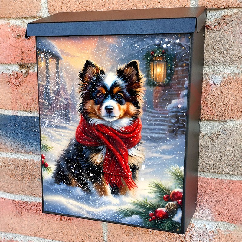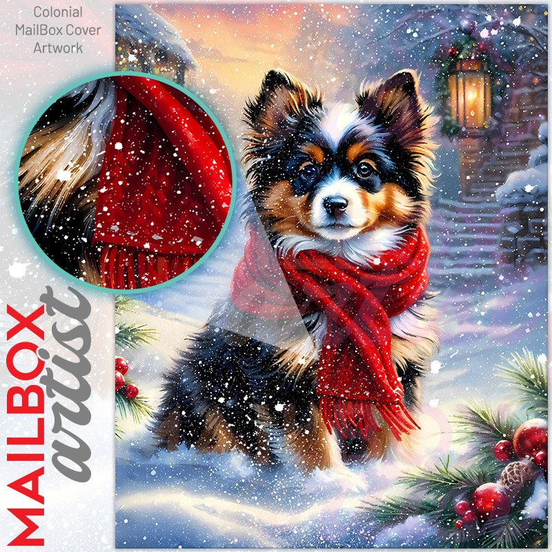 With this Christmas Puppy in red Scarf colonial mailbox cover it’s pretty easy to convert your mailbox to a special and unique item. These covers require a flat surface, so they work with colonial mailboxes that do not have any embossed decoration or signs. Magnetic mailbox covers work with steel colonial boxes only, while self-adhesive vinyl covers are available for aluminum, plastic and steel boxes. We also offer both self-adhesive and magnetic covers with regular opaque white vinyl or reflective vinyl, which works similarly to license plates or road signs. The reflective option makes the entire cover’s surface reflective, ensuring visibility at night. In case your mailbox doesn’t work with these covers, you can purchase the preinstalled cover on a brand new mailbox as well. Also, you can create your custom colonial mailbox cover using you own pictures, adding your name, street number, etc.