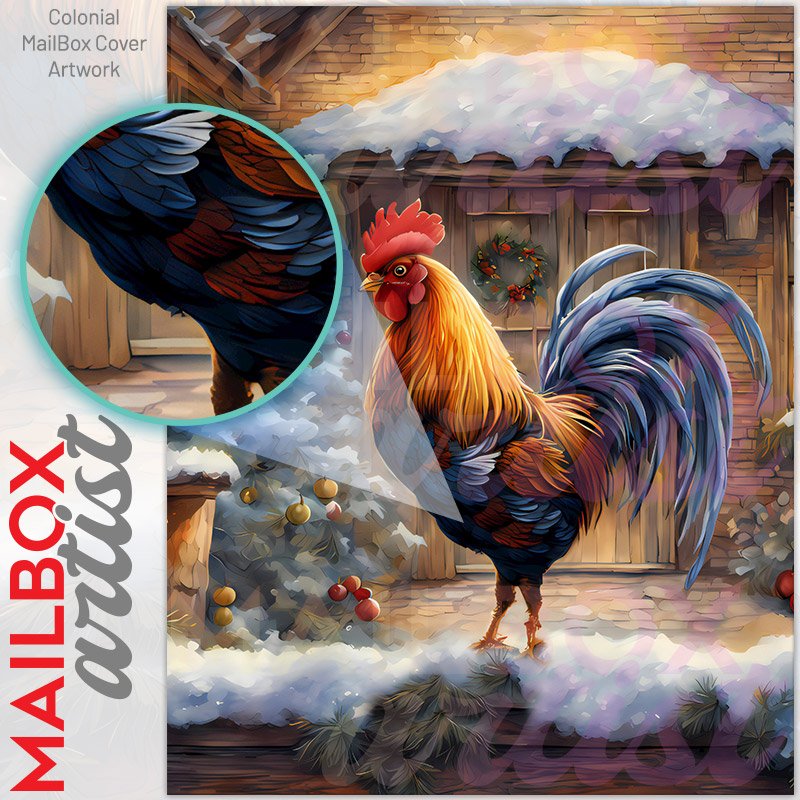 With this Christmas Rooster on the Porch colonial mailbox cover it’s pretty easy to convert your mailbox to a special and unique item. These covers require a flat surface, so they work with colonial mailboxes that do not have any embossed decoration or signs. Magnetic mailbox covers work with steel colonial boxes only, while self-adhesive vinyl covers are available for aluminum, plastic and steel boxes. We also offer both self-adhesive and magnetic covers with regular opaque white vinyl or reflective vinyl, which works similarly to license plates or road signs. The reflective option makes the entire cover’s surface reflective, ensuring visibility at night. In case your mailbox doesn’t work with these covers, you can purchase the preinstalled cover on a brand new mailbox as well. Also, you can create your custom colonial mailbox cover using you own pictures, adding your name, street number, etc.