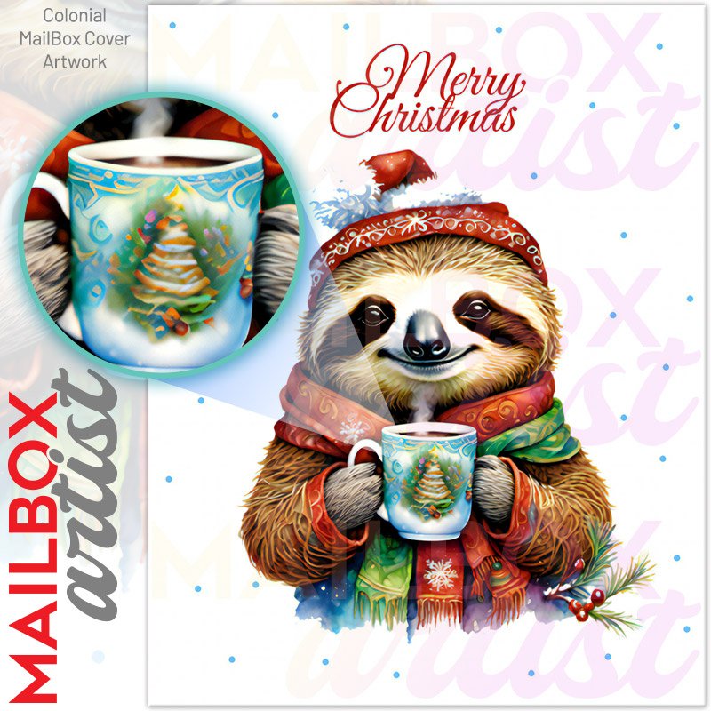 With this Christmas Sloth Drinking Hot Cocoa colonial mailbox cover it’s pretty easy to convert your mailbox to a special and unique item. These covers require a flat surface, so they work with colonial mailboxes that do not have any embossed decoration or signs. Magnetic mailbox covers work with steel colonial boxes only, while self-adhesive vinyl covers are available for aluminum, plastic and steel boxes. We also offer both self-adhesive and magnetic covers with regular opaque white vinyl or reflective vinyl, which works similarly to license plates or road signs. The reflective option makes the entire cover’s surface reflective, ensuring visibility at night. In case your mailbox doesn’t work with these covers, you can purchase the preinstalled cover on a brand new mailbox as well. Also, you can create your custom colonial mailbox cover using you own pictures, adding your name, street number, etc.