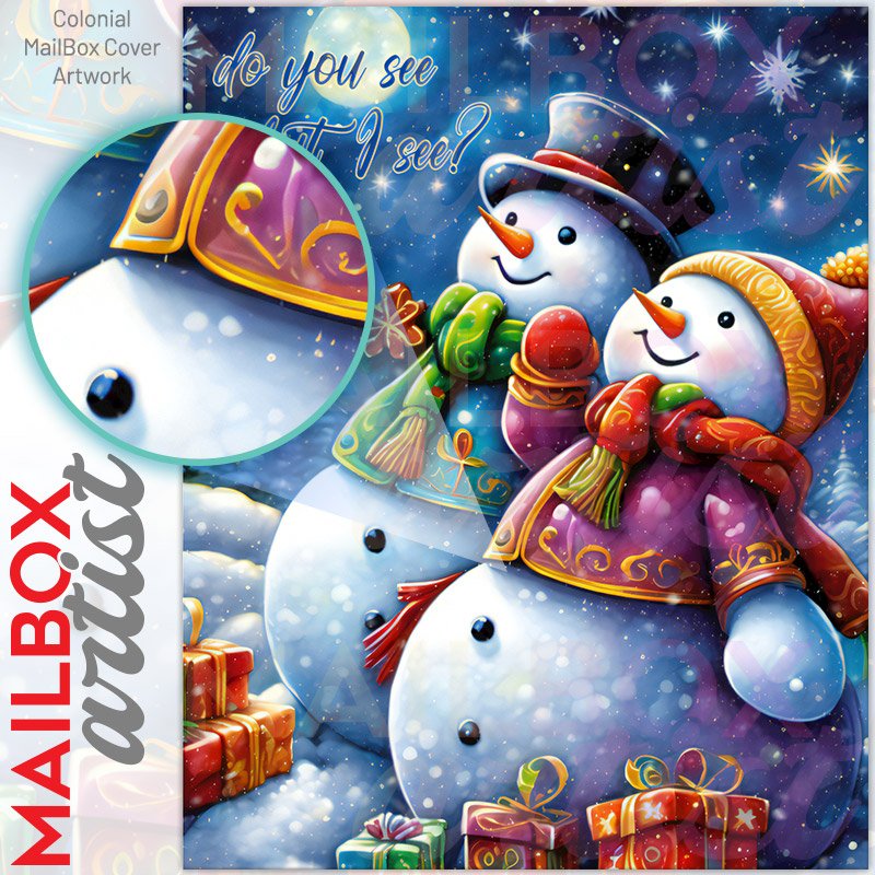 With this Christmas Snowman Couple colonial mailbox cover it’s pretty easy to convert your mailbox to a special and unique item. These covers require a flat surface, so they work with colonial mailboxes that do not have any embossed decoration or signs. Magnetic mailbox covers work with steel colonial boxes only, while self-adhesive vinyl covers are available for aluminum, plastic and steel boxes. We also offer both self-adhesive and magnetic covers with regular opaque white vinyl or reflective vinyl, which works similarly to license plates or road signs. The reflective option makes the entire cover’s surface reflective, ensuring visibility at night. In case your mailbox doesn’t work with these covers, you can purchase the preinstalled cover on a brand new mailbox as well. Also, you can create your custom colonial mailbox cover using you own pictures, adding your name, street number, etc.