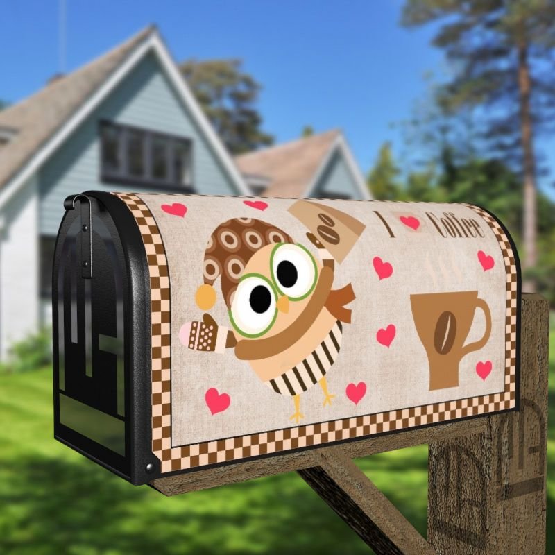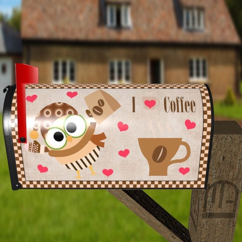 Grab this creative Coffee Lover Owl #10 – I Heart Coffee rural/curbside/farm mailbox cover as self adhesive vinyl or magnetic cover. Our magnetic covers have the magnetic surface under the whole design, not only two magnet strips like in cheaper products. We also offer both the self adhesive and the magnetic covers with regular opaque white vinyl or reflective vinyl which works the same way as the licence plates or road signs; pretty visible at night. We make these covers for both large and small mailboxes.
