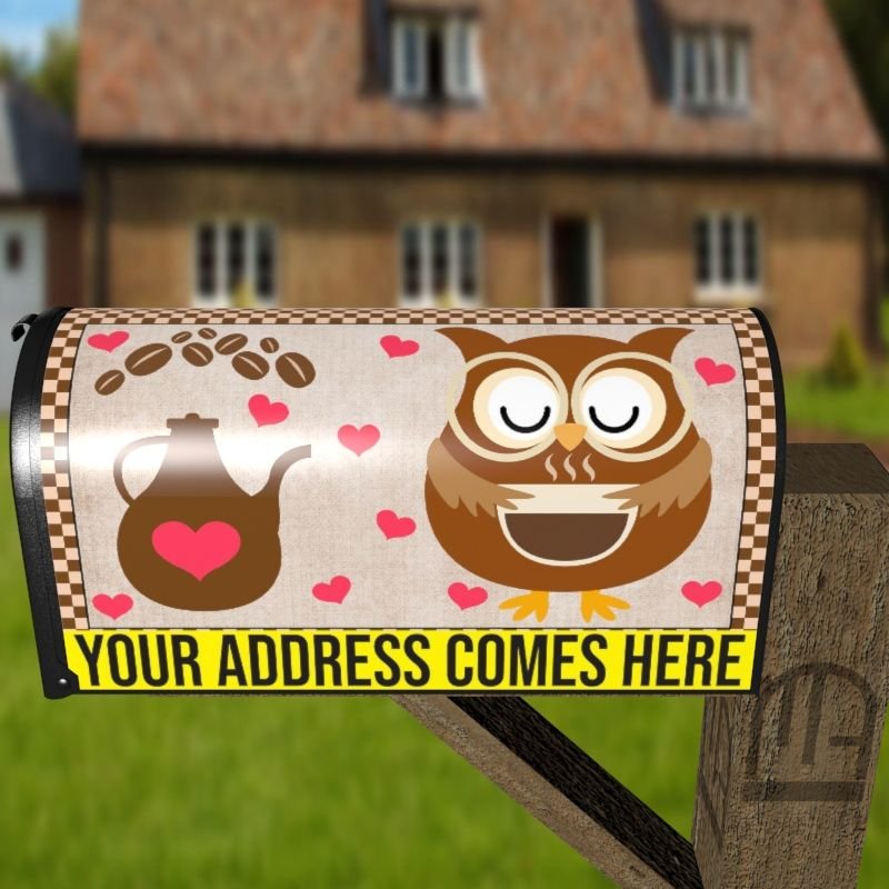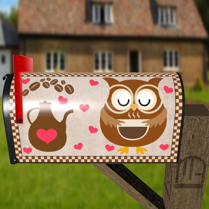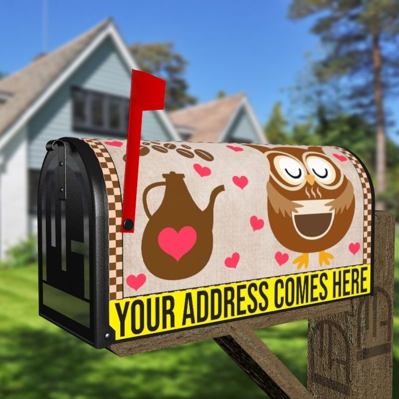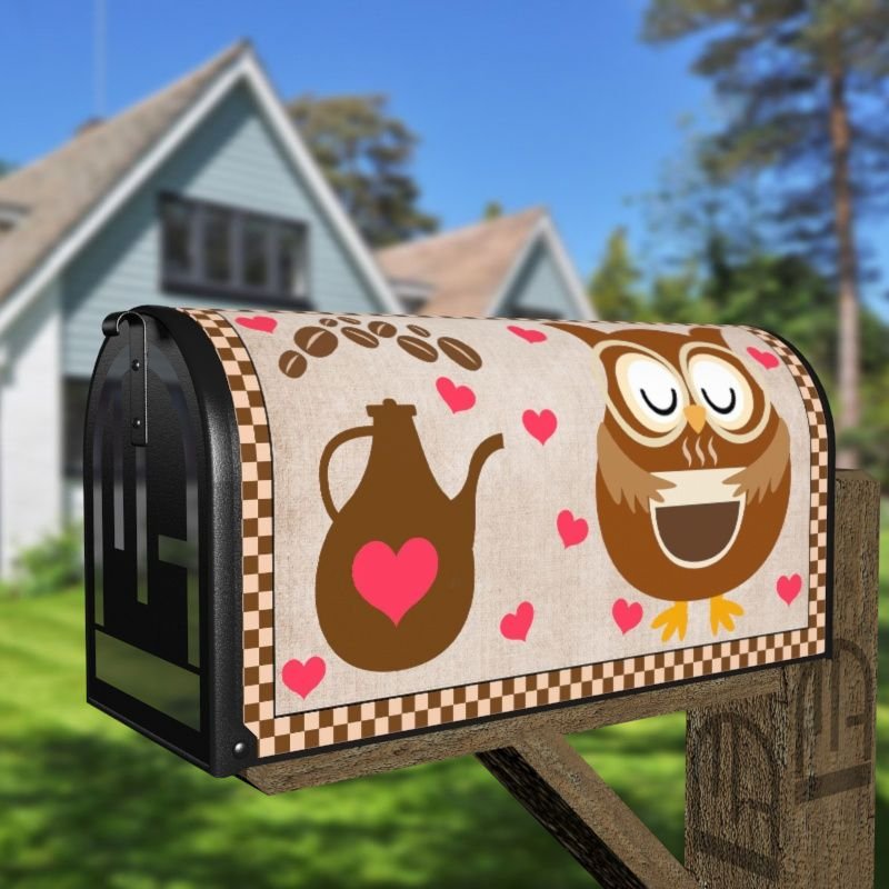 Grab this creative Coffee Lover Owl #4 rural/curbside/farm mailbox cover as self adhesive vinyl or magnetic cover. Our magnetic covers have the magnetic surface under the whole design, not only two magnet strips like in cheaper products. We also offer both the self adhesive and the magnetic covers with regular opaque white vinyl or reflective vinyl which works the same way as the licence plates or road signs; pretty visible at night. We make these covers for both large and small mailboxes.