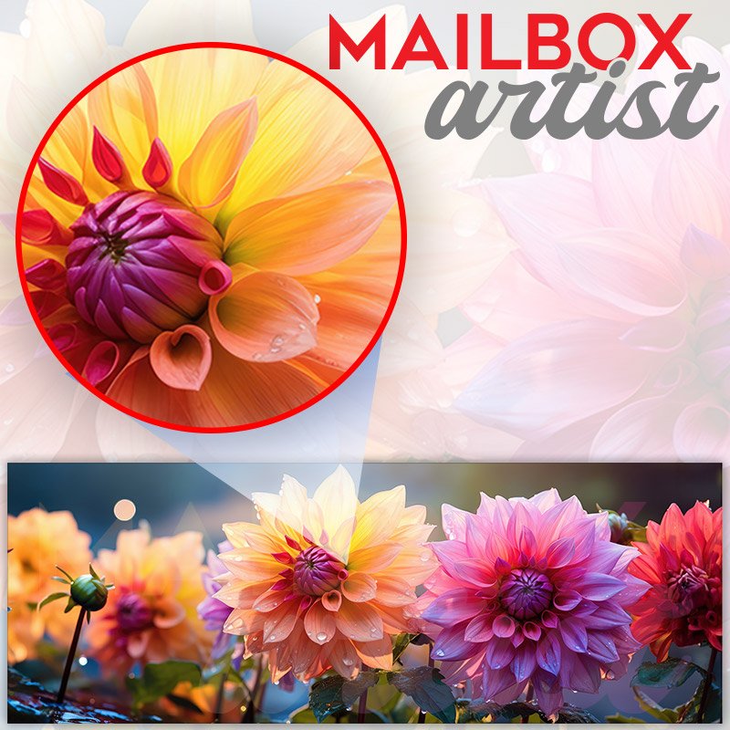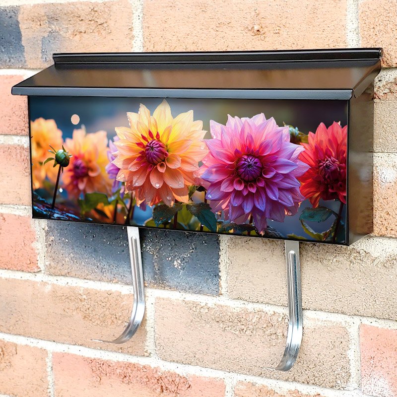 Applying your Colorful Dahlia Mix Blooms With Raindrops townhouse / ranch mailbox cover it’s pretty easy to convert your mailbox to a special and unique item. These covers require a flat surface, so they work with townhouse / ranch mailboxes that do not have any embossed decoration or signs. Magnetic mailbox covers work with steel boxes, for aluminum and plastic boxes we offer the self-adhesive vinyl covers. In case your mailbox doesn’t work with these covers, you can purchase the preinstalled cover on a brand new mailbox as well. Also, you can create your custom townhouse / ranch mailbox cover using you own pictures, adding your name, street number, etc.