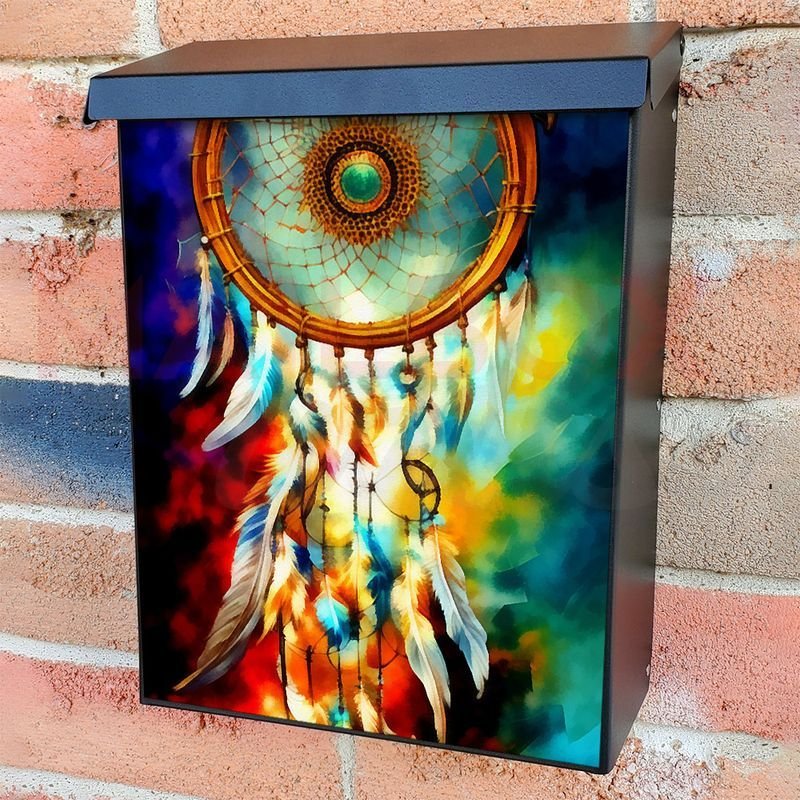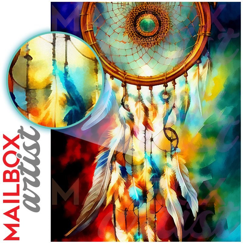 With this Colorful Dreamcatcher #2 colonial mailbox cover it’s pretty easy to convert your mailbox to a special and unique item. These covers require a flat surface, so they work with colonial mailboxes that do not have any embossed decoration or signs. In case your mailbox doesn’t work with these covers, you can purchase the preinstalled cover on a brand new mailbox as well. Also, you can create your custom colonial mailbox cover using you own pictures, adding your name, street number, etc.