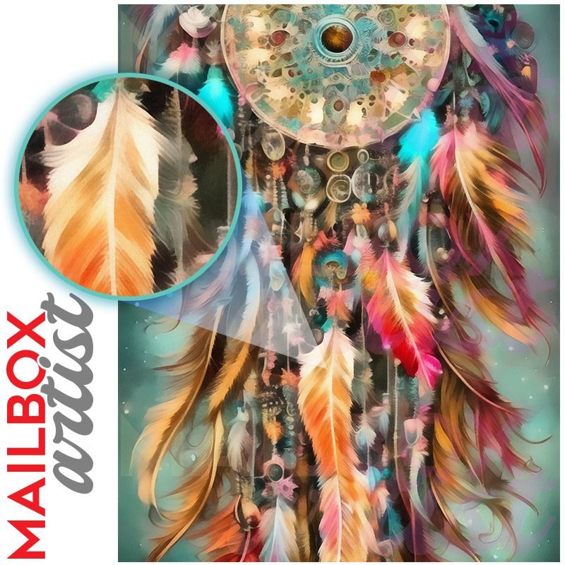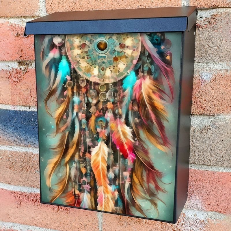 With this Colorful Dreamcatcher #7 colonial mailbox cover it’s pretty easy to convert your mailbox to a special and unique item. These covers require a flat surface, so they work with colonial mailboxes that do not have any embossed decoration or signs. In case your mailbox doesn’t work with these covers, you can purchase the preinstalled cover on a brand new mailbox as well. Also, you can create your custom colonial mailbox cover using you own pictures, adding your name, street number, etc.