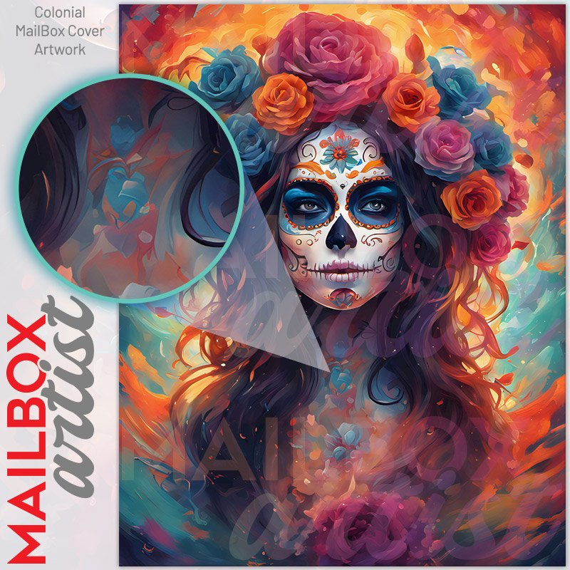 With this Colorful Dreamy Sugar Skull Girl colonial mailbox cover it’s pretty easy to convert your mailbox to a special and unique item. These covers require a flat surface, so they work with colonial mailboxes that do not have any embossed decoration or signs. Magnetic mailbox covers work with steel colonial boxes only, while self-adhesive vinyl covers are available for aluminum, plastic and steel boxes. We also offer both self-adhesive and magnetic covers with regular opaque white vinyl or reflective vinyl, which works similarly to license plates or road signs. The reflective option makes the entire cover’s surface reflective, ensuring visibility at night. In case your mailbox doesn’t work with these covers, you can purchase the preinstalled cover on a brand new mailbox as well. Also, you can create your custom colonial mailbox cover using you own pictures, adding your name, street number, etc.