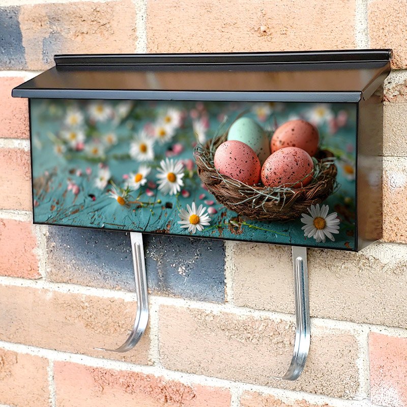 Applying your Colorful Easter Eggs In A Basket With White Flowers townhouse / ranch mailbox cover it’s pretty easy to convert your mailbox to a special and unique item. These covers require a flat surface, so they work with townhouse / ranch mailboxes that do not have any embossed decoration or signs. Magnetic mailbox covers work with steel boxes, for aluminum and plastic boxes we offer the self-adhesive vinyl covers. In case your mailbox doesn’t work with these covers, you can purchase the preinstalled cover on a brand new mailbox as well. Also, you can create your custom townhouse / ranch mailbox cover using you own pictures, adding your name, street number, etc.