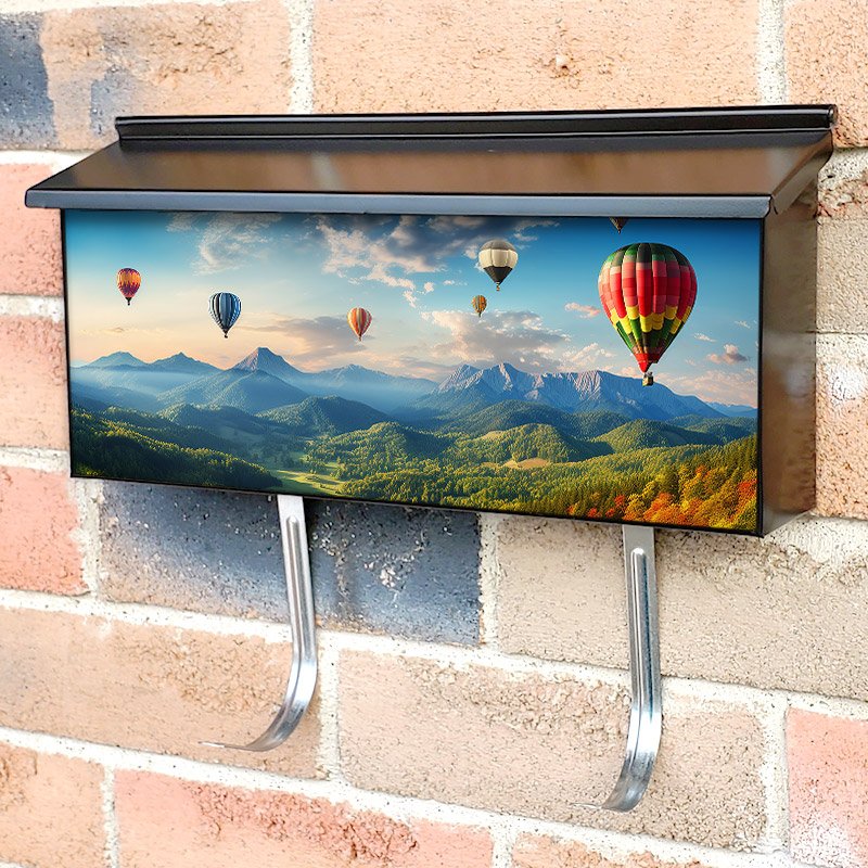 Applying your Colorful Hot Air Balloons Flying Over Mountain townhouse / ranch mailbox cover it’s pretty easy to convert your mailbox to a special and unique item. These covers require a flat surface, so they work with townhouse / ranch mailboxes that do not have any embossed decoration or signs. Magnetic mailbox covers work with steel boxes, for aluminum and plastic boxes we offer the self-adhesive vinyl covers. In case your mailbox doesn’t work with these covers, you can purchase the preinstalled cover on a brand new mailbox as well. Also, you can create your custom townhouse / ranch mailbox cover using you own pictures, adding your name, street number, etc.