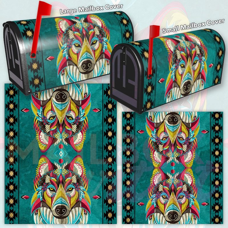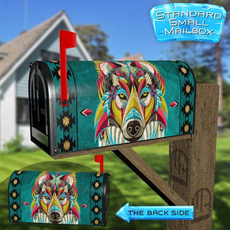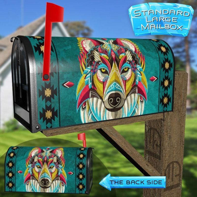 Dressing up your rural farm mailbox with the Colorful Native Wolf mailbox cover is an easy way to convert it into a unique and special item. These covers require a smooth surface, so they are compatible with rural farm mailboxes that do not have any embossed decorations or signs. Magnetic mailbox covers work with steel boxes only, while self-adhesive vinyl covers are available for aluminum, plastic and steel boxes. If your mailbox is not compatible with these covers, you can purchase a brand new mailbox with a preinstalled cover. Additionally, you have the option to create a custom rural farm mailbox cover with your own pictures, name, street number, etc.