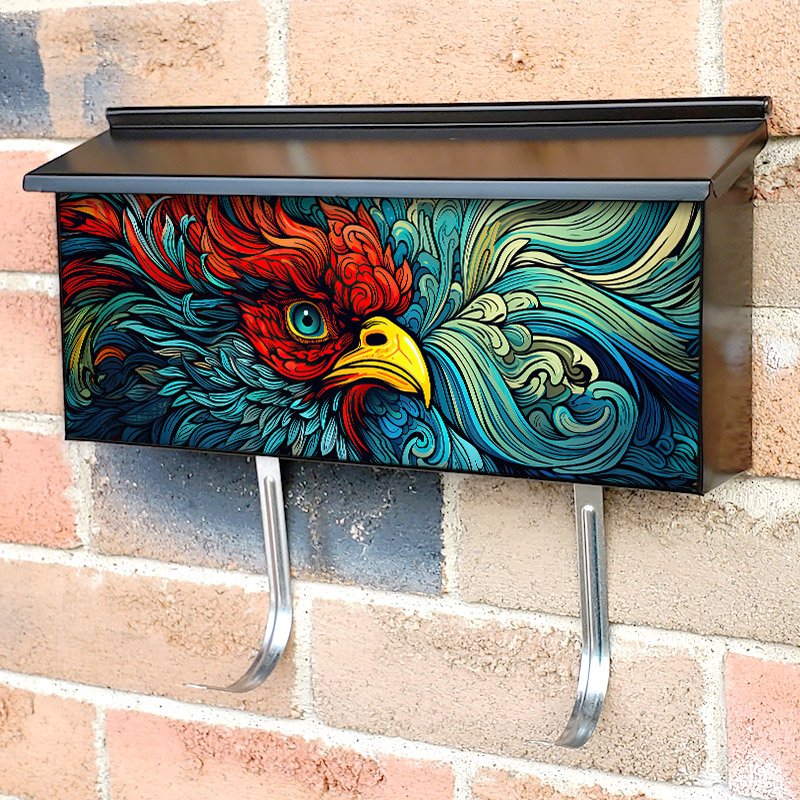 Applying your Colorful Rooster Illustration 6 townhouse / ranch mailbox cover it’s pretty easy to convert your mailbox to a special and unique item. These covers require a flat surface, so they work with townhouse / ranch mailboxes that do not have any embossed decoration or signs. Magnetic mailbox covers work with steel boxes, for aluminum and plastic boxes we offer the self-adhesive vinyl covers. In case your mailbox doesn’t work with these covers, you can purchase the preinstalled cover on a brand new mailbox as well. Also, you can create your custom townhouse / ranch mailbox cover using you own pictures, adding your name, street number, etc.