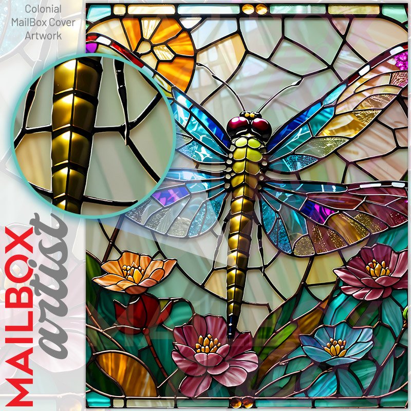 With this Colorful Stained Glass Dragonfly colonial mailbox cover it’s pretty easy to convert your mailbox to a special and unique item. These covers require a flat surface, so they work with colonial mailboxes that do not have any embossed decoration or signs. Magnetic mailbox covers work with steel colonial boxes only, while self-adhesive vinyl covers are available for aluminum, plastic and steel boxes. We also offer both self-adhesive and magnetic covers with regular opaque white vinyl or reflective vinyl, which works similarly to license plates or road signs. The reflective option makes the entire cover’s surface reflective, ensuring visibility at night. In case your mailbox doesn’t work with these covers, you can purchase the preinstalled cover on a brand new mailbox as well. Also, you can create your custom colonial mailbox cover using you own pictures, adding your name, street number, etc.