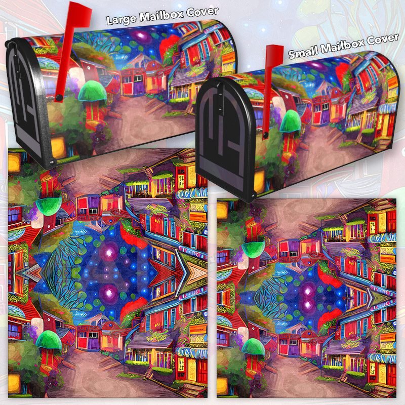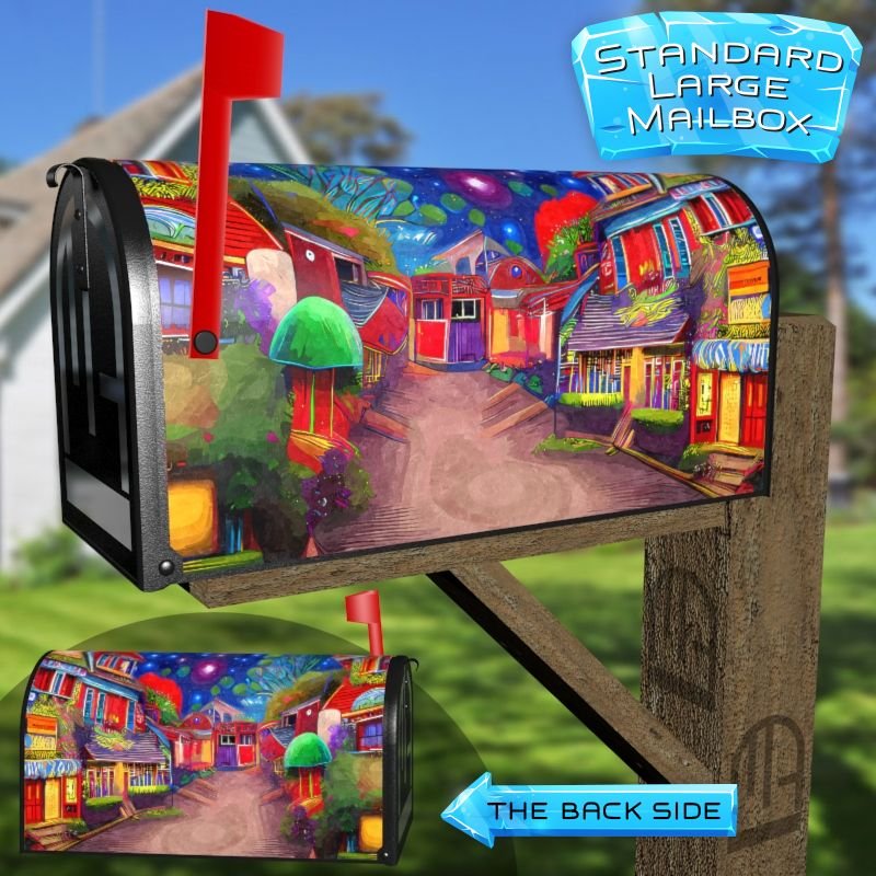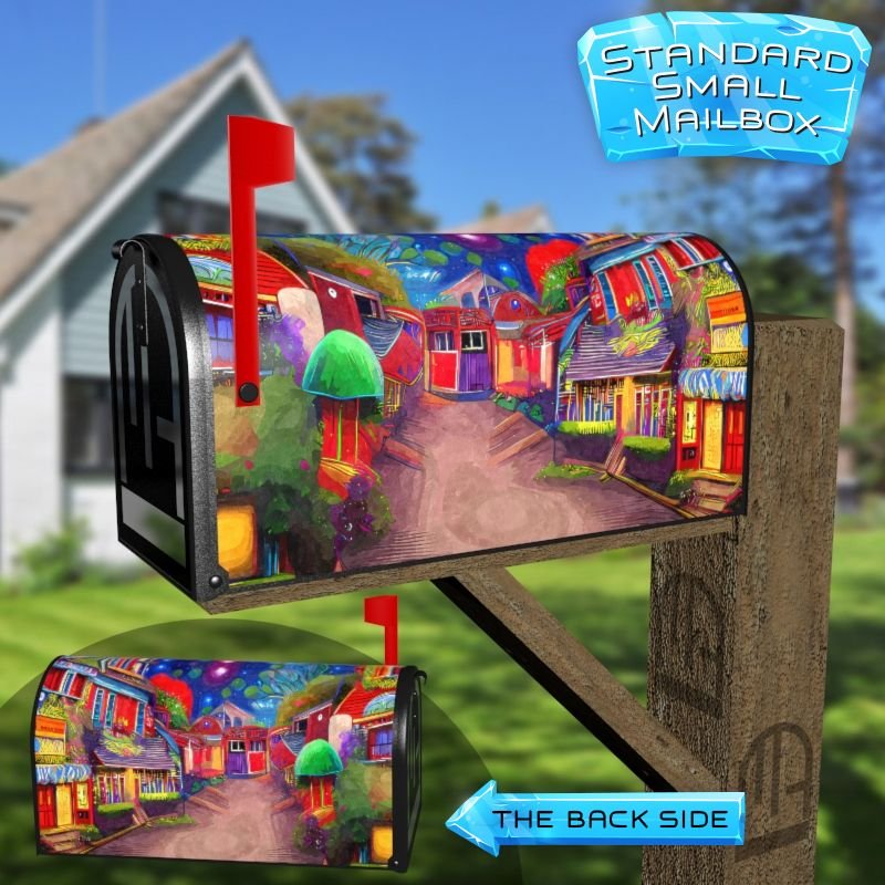 Dressing up your rural farm mailbox with the Colorful Village at Night mailbox cover is an easy way to convert it into a unique and special item. These covers require a smooth surface, so they are compatible with rural farm mailboxes that do not have any embossed decorations or signs. Magnetic mailbox covers work with steel boxes only, while self-adhesive vinyl covers are available for aluminum, plastic and steel boxes. If your mailbox is not compatible with these covers, you can purchase a brand new mailbox with a preinstalled cover. Additionally, you have the option to create a custom rural farm mailbox cover with your own pictures, name, street number, etc.