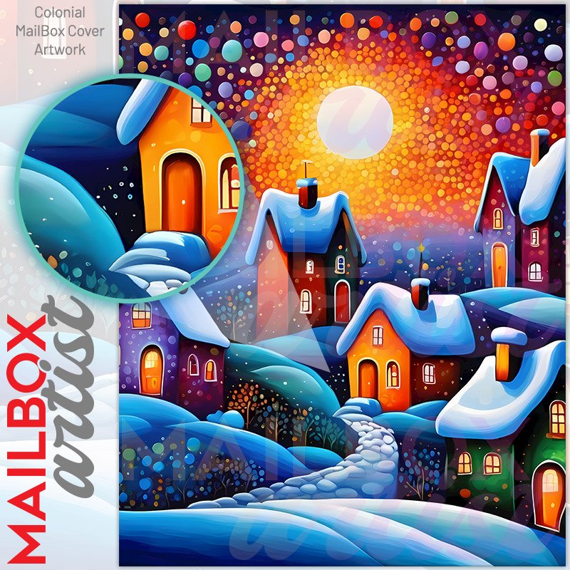 With this Colorful Winter Village colonial mailbox cover it’s pretty easy to convert your mailbox to a special and unique item. These covers require a flat surface, so they work with colonial mailboxes that do not have any embossed decoration or signs. Magnetic mailbox covers work with steel colonial boxes only, while self-adhesive vinyl covers are available for aluminum, plastic and steel boxes. We also offer both self-adhesive and magnetic covers with regular opaque white vinyl or reflective vinyl, which works similarly to license plates or road signs. The reflective option makes the entire cover’s surface reflective, ensuring visibility at night. In case your mailbox doesn’t work with these covers, you can purchase the preinstalled cover on a brand new mailbox as well. Also, you can create your custom colonial mailbox cover using you own pictures, adding your name, street number, etc.