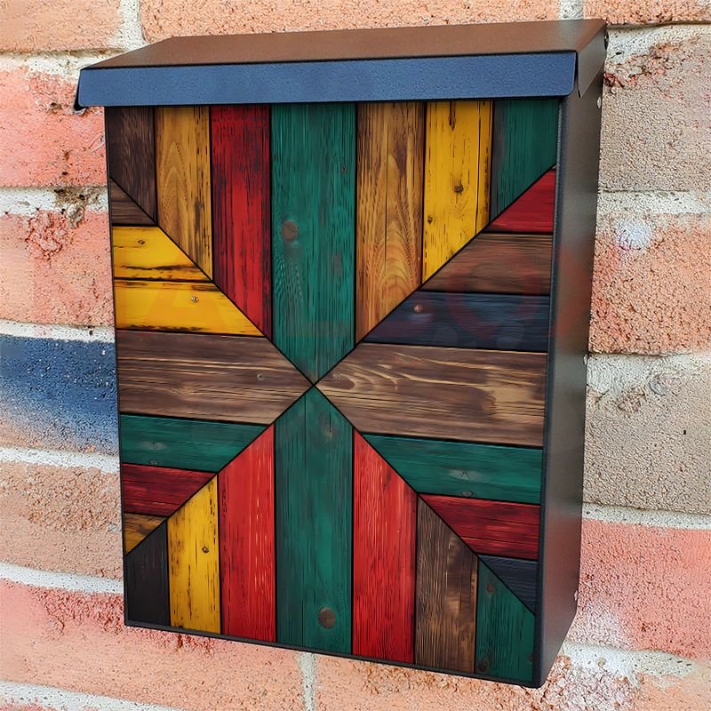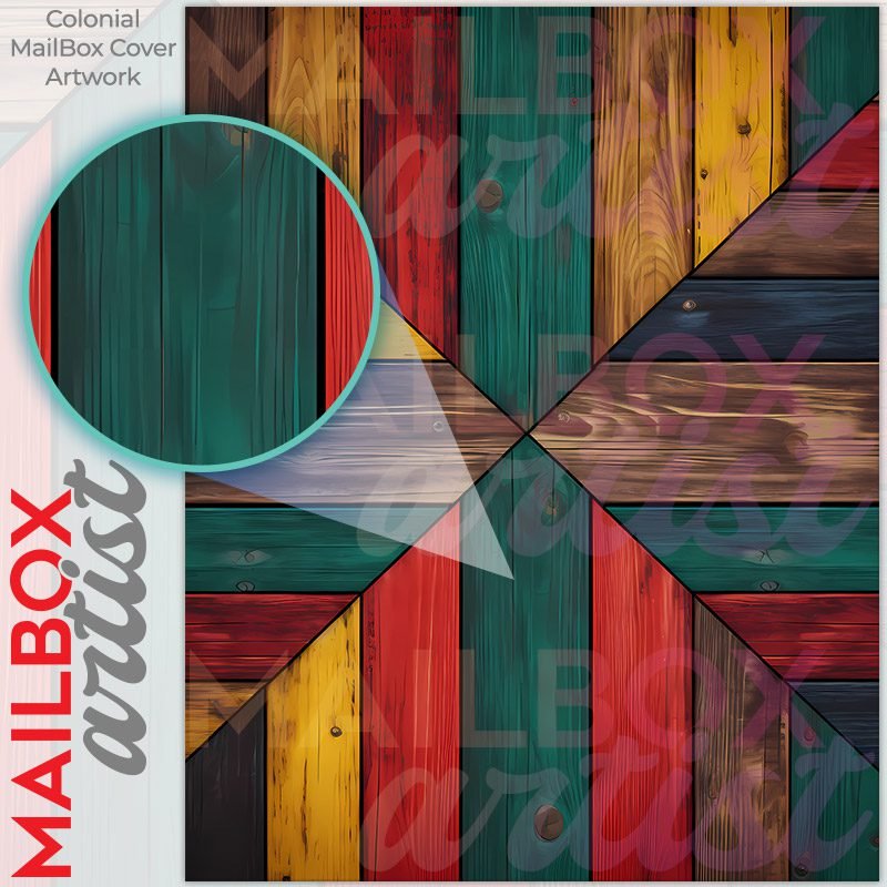With this Colorful Wood Quilt Design colonial mailbox cover it’s pretty easy to convert your mailbox to a special and unique item. These covers require a flat surface, so they work with colonial mailboxes that do not have any embossed decoration or signs. Magnetic mailbox covers work with steel colonial boxes only, while self-adhesive vinyl covers are available for aluminum, plastic and steel boxes. We also offer both self-adhesive and magnetic covers with regular opaque white vinyl or reflective vinyl, which works similarly to license plates or road signs. The reflective option makes the entire cover’s surface reflective, ensuring visibility at night. In case your mailbox doesn’t work with these covers, you can purchase the preinstalled cover on a brand new mailbox as well. Also, you can create your custom colonial mailbox cover using you own pictures, adding your name, street number, etc.