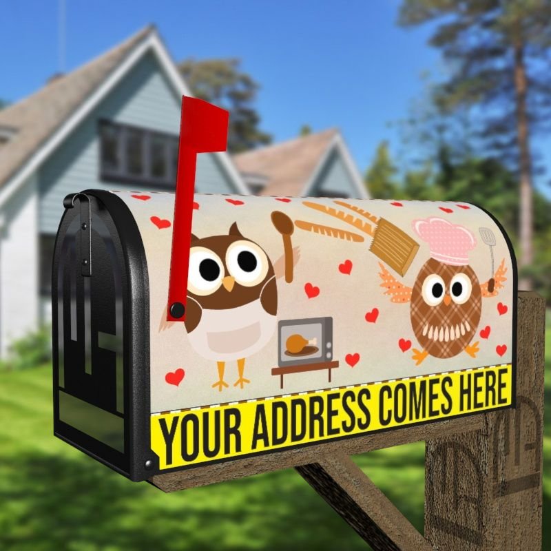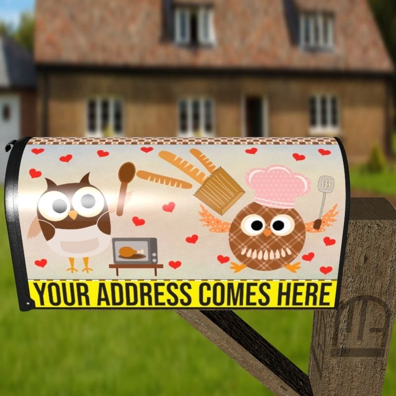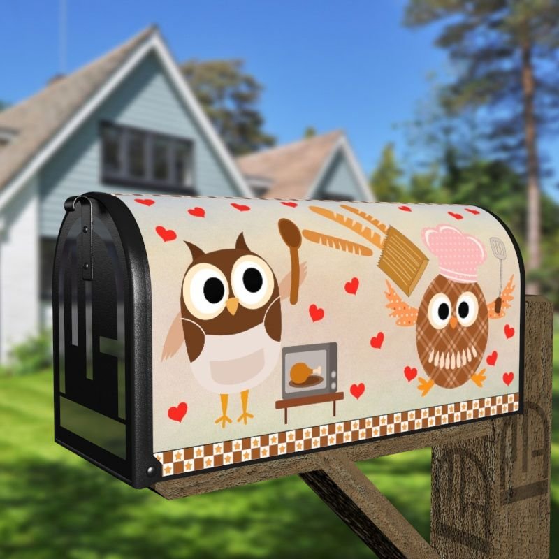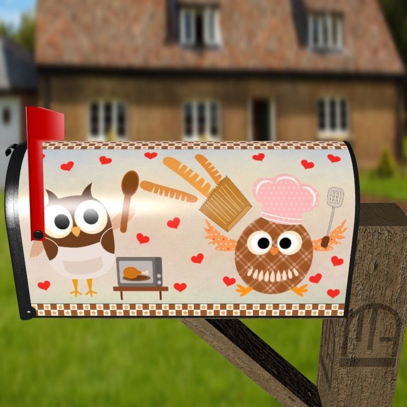 Grab this creative Cooking Owl #10 rural/curbside/farm mailbox cover as self adhesive vinyl or magnetic cover. Our magnetic covers have the magnetic surface under the whole design, not only two magnet strips like in cheaper products. We also offer both the self adhesive and the magnetic covers with regular opaque white vinyl or reflective vinyl which works the same way as the licence plates or road signs; pretty visible at night. We make these covers for both large and small mailboxes.