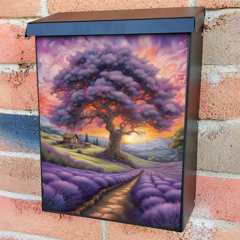 With this Cottage and Tree in the Lavenders colonial mailbox cover it’s pretty easy to convert your mailbox to a special and unique item. These covers require a flat surface, so they work with colonial mailboxes that do not have any embossed decoration or signs. Magnetic mailbox covers work with steel colonial boxes only, while self-adhesive vinyl covers are available for aluminum, plastic and steel boxes. We also offer both self-adhesive and magnetic covers with regular opaque white vinyl or reflective vinyl, which works similarly to license plates or road signs. The reflective option makes the entire cover’s surface reflective, ensuring visibility at night. In case your mailbox doesn’t work with these covers, you can purchase the preinstalled cover on a brand new mailbox as well. Also, you can create your custom colonial mailbox cover using you own pictures, adding your name, street number, etc.