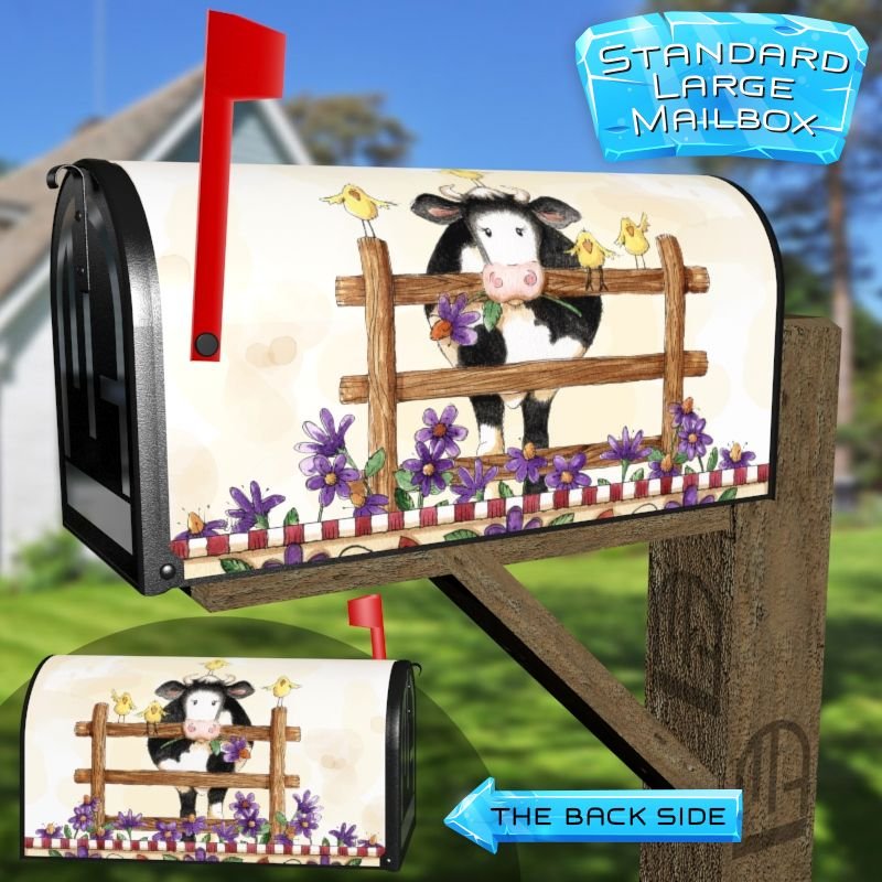 Dressing up your rural farm mailbox with the Country Cow and Flowers #4 mailbox cover is an easy way to convert it into a unique and special item. These covers require a smooth surface, so they are compatible with rural farm mailboxes that do not have any embossed decorations or signs. Magnetic mailbox covers work with steel boxes only, while self-adhesive vinyl covers are available for aluminum, plastic and steel boxes. If your mailbox is not compatible with these covers, you can purchase a brand new mailbox with a preinstalled cover. Additionally, you have the option to create a custom rural farm mailbox cover with your own pictures, name, street number, etc.