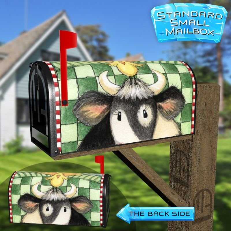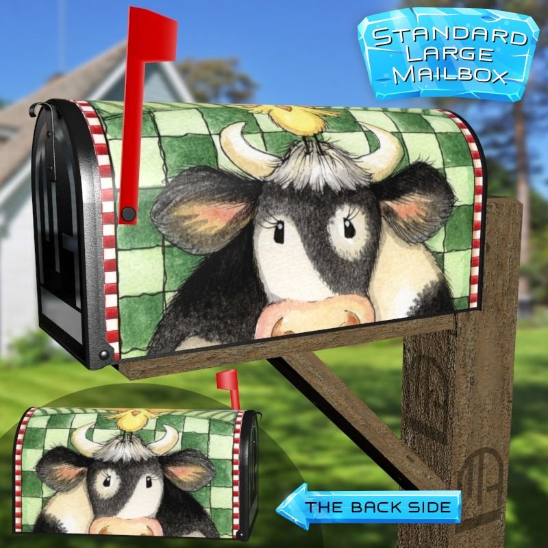 Dressing up your rural farm mailbox with the Country Cow and Flowers #6 mailbox cover is an easy way to convert it into a unique and special item. These covers require a smooth surface, so they are compatible with rural farm mailboxes that do not have any embossed decorations or signs. Magnetic mailbox covers work with steel boxes only, while self-adhesive vinyl covers are available for aluminum, plastic and steel boxes. If your mailbox is not compatible with these covers, you can purchase a brand new mailbox with a preinstalled cover. Additionally, you have the option to create a custom rural farm mailbox cover with your own pictures, name, street number, etc.