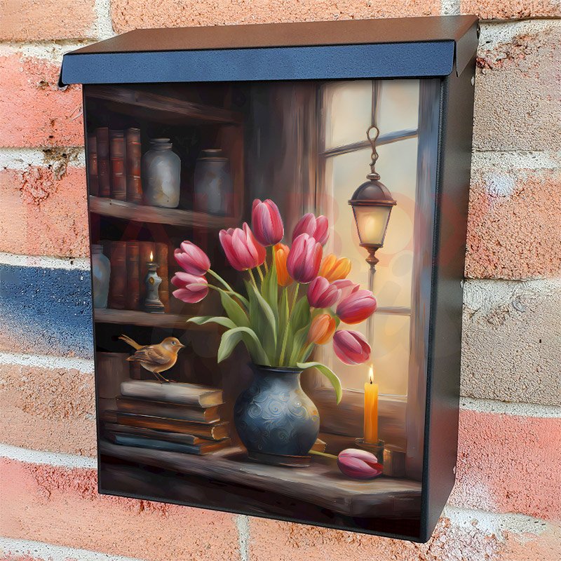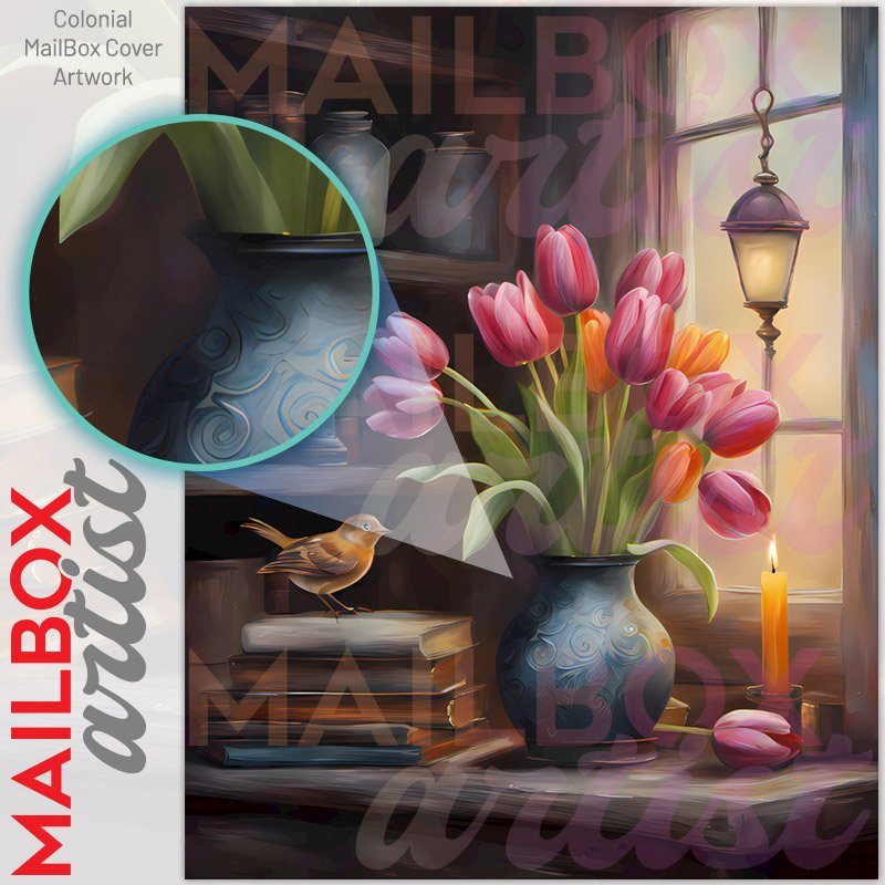 With this Country Shelf with Tulips and Bird colonial mailbox cover it’s pretty easy to convert your mailbox to a special and unique item. These covers require a flat surface, so they work with colonial mailboxes that do not have any embossed decoration or signs. Magnetic mailbox covers work with steel colonial boxes only, while self-adhesive vinyl covers are available for aluminum, plastic and steel boxes. We also offer both self-adhesive and magnetic covers with regular opaque white vinyl or reflective vinyl, which works similarly to license plates or road signs. The reflective option makes the entire cover’s surface reflective, ensuring visibility at night. In case your mailbox doesn’t work with these covers, you can purchase the preinstalled cover on a brand new mailbox as well. Also, you can create your custom colonial mailbox cover using you own pictures, adding your name, street number, etc.