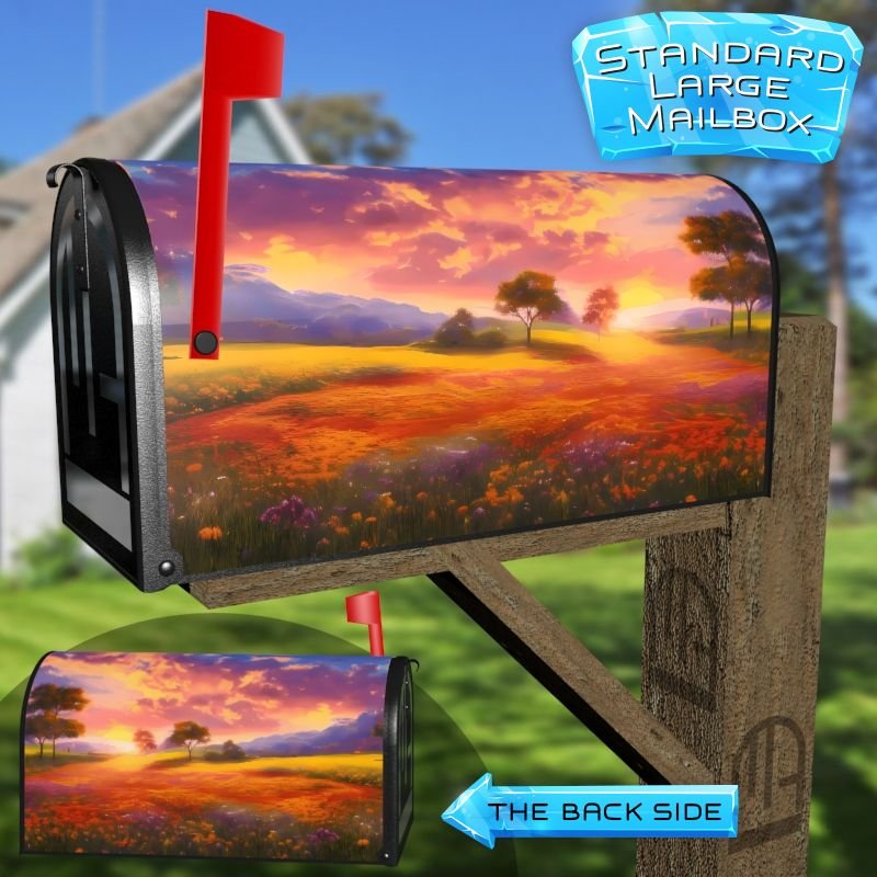 Dressing up your rural farm mailbox with the Countryside Sunset mailbox cover is an easy way to convert it into a unique and special item. These covers require a smooth surface, so they are compatible with rural farm mailboxes that do not have any embossed decorations or signs. Magnetic mailbox covers work with steel boxes only, while self-adhesive vinyl covers are available for aluminum, plastic and steel boxes. If your mailbox is not compatible with these covers, you can purchase a brand new mailbox with a preinstalled cover. Additionally, you have the option to create a custom rural farm mailbox cover with your own pictures, name, street number, etc.