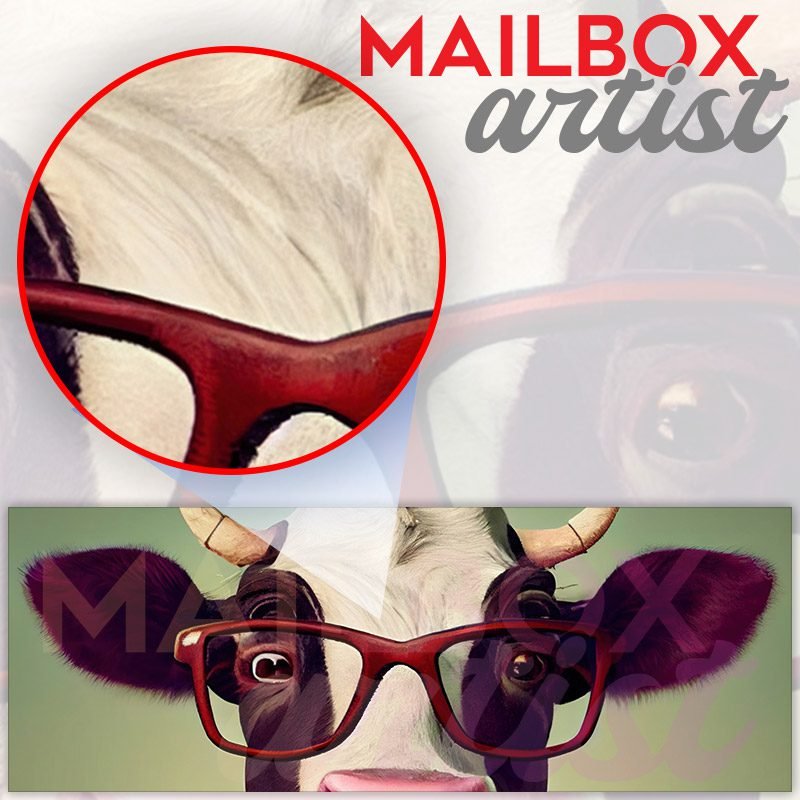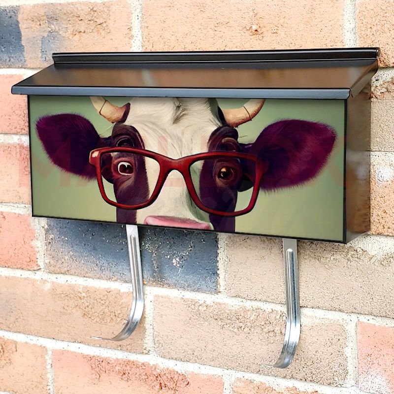 Applying your Cow in Eyeglasses #4 townhouse / ranch mailbox cover it’s pretty easy to convert your mailbox to a special and unique item. These covers require a flat surface, so they work with townhouse / ranch mailboxes that do not have any embossed decoration or signs. Magnetic mailbox covers work with steel boxes, for aluminum and plastic boxes we offer the self-adhesive vinyl covers. In case your mailbox doesn’t work with these covers, you can purchase the preinstalled cover on a brand new mailbox as well. Also, you can create your custom townhouse / ranch mailbox cover using you own pictures, adding your name, street number, etc.