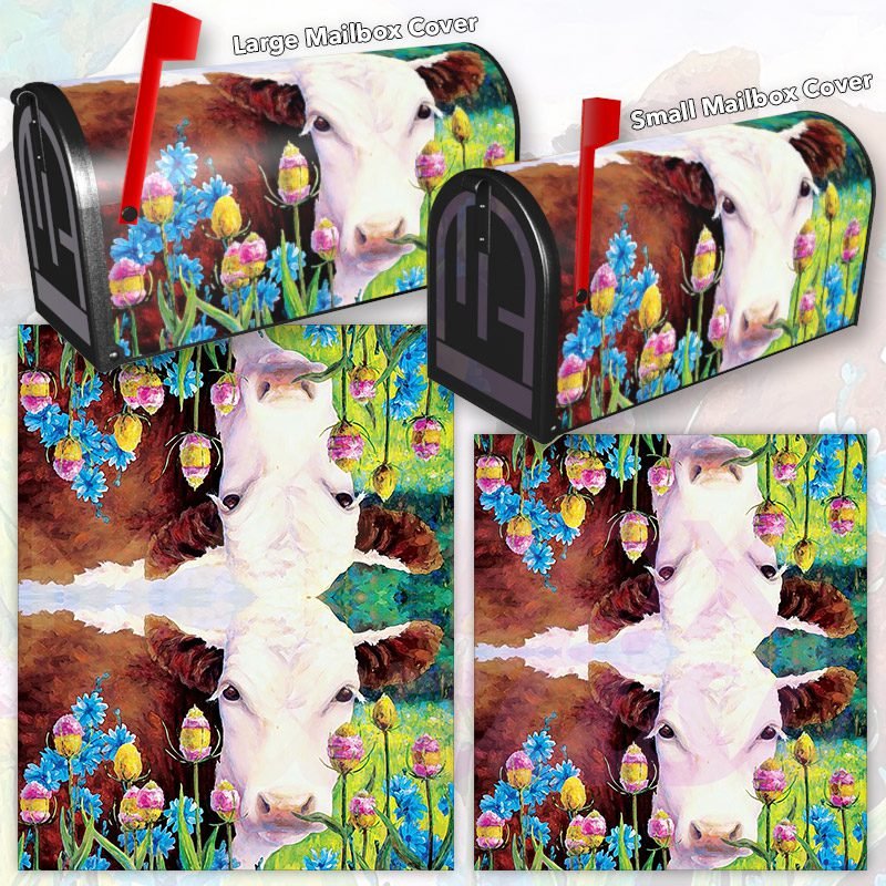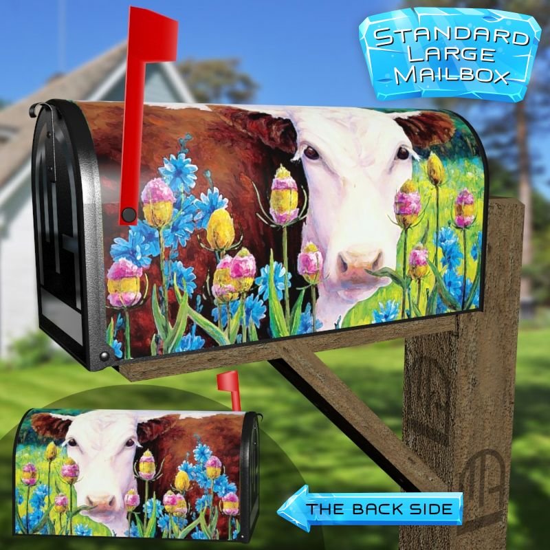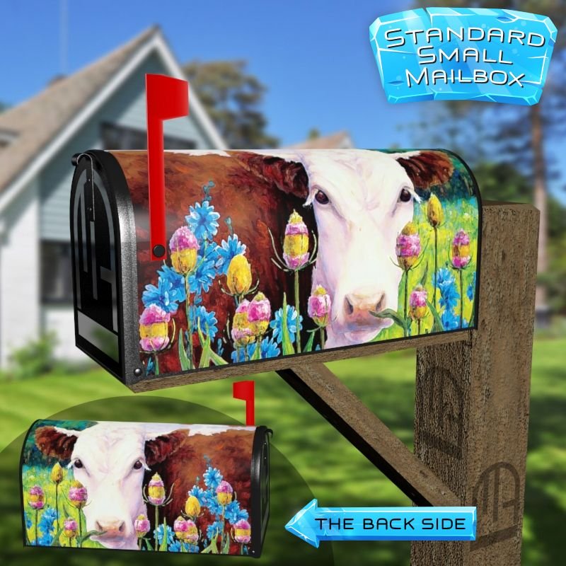 Dressing up your rural farm mailbox with the Cow in the Meadow mailbox cover is an easy way to convert it into a unique and special item. These covers require a smooth surface, so they are compatible with rural farm mailboxes that do not have any embossed decorations or signs. Magnetic mailbox covers work with steel boxes only, while self-adhesive vinyl covers are available for aluminum, plastic and steel boxes. If your mailbox is not compatible with these covers, you can purchase a brand new mailbox with a preinstalled cover. Additionally, you have the option to create a custom rural farm mailbox cover with your own pictures, name, street number, etc.