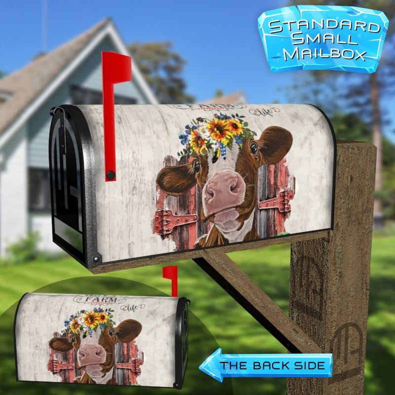 Dressing up your rural farm mailbox with the Cow with Sunflowers #2 mailbox cover is an easy way to convert it into a unique and special item. These covers require a smooth surface, so they are compatible with rural farm mailboxes that do not have any embossed decorations or signs. Magnetic mailbox covers work with steel boxes only, while self-adhesive vinyl covers are available for aluminum, plastic and steel boxes. If your mailbox is not compatible with these covers, you can purchase a brand new mailbox with a preinstalled cover. Additionally, you have the option to create a custom rural farm mailbox cover with your own pictures, name, street number, etc.