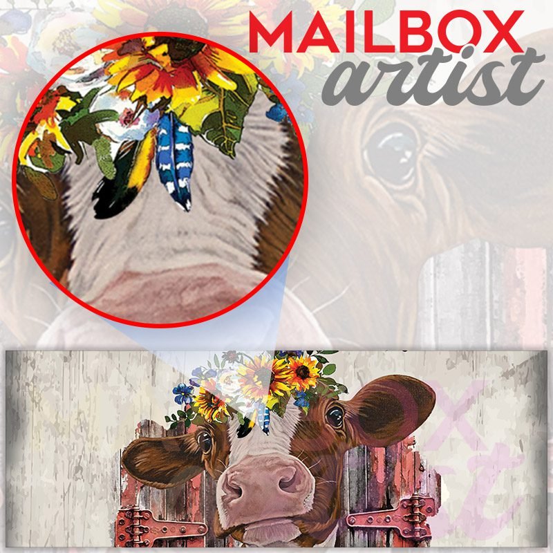 Applying your Cow with Sunflowers #2 townhouse / ranch mailbox cover it’s pretty easy to convert your mailbox to a special and unique item. These covers require a flat surface, so they work with townhouse / ranch mailboxes that do not have any embossed decoration or signs. Magnetic mailbox covers work with steel boxes, for aluminum and plastic boxes we offer the self-adhesive vinyl covers. In case your mailbox doesn’t work with these covers, you can purchase the preinstalled cover on a brand new mailbox as well. Also, you can create your custom townhouse / ranch mailbox cover using you own pictures, adding your name, street number, etc.