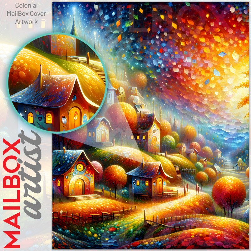 With this Cozy Autumn Village colonial mailbox cover it’s pretty easy to convert your mailbox to a special and unique item. These covers require a flat surface, so they work with colonial mailboxes that do not have any embossed decoration or signs. Magnetic mailbox covers work with steel colonial boxes only, while self-adhesive vinyl covers are available for aluminum, plastic and steel boxes. We also offer both self-adhesive and magnetic covers with regular opaque white vinyl or reflective vinyl, which works similarly to license plates or road signs. The reflective option makes the entire cover’s surface reflective, ensuring visibility at night. In case your mailbox doesn’t work with these covers, you can purchase the preinstalled cover on a brand new mailbox as well. Also, you can create your custom colonial mailbox cover using you own pictures, adding your name, street number, etc.
