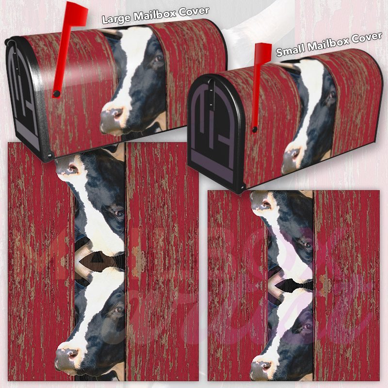 Dressing up your rural farm mailbox with the Curious Cow at the Barn Door mailbox cover is an easy way to convert it into a unique and special item. These covers require a smooth surface, so they are compatible with rural farm mailboxes that do not have any embossed decorations or signs. Magnetic mailbox covers work with steel boxes only, while self-adhesive vinyl covers are available for aluminum, plastic and steel boxes. If your mailbox is not compatible with these covers, you can purchase a brand new mailbox with a preinstalled cover. Additionally, you have the option to create a custom rural farm mailbox cover with your own pictures, name, street number, etc.