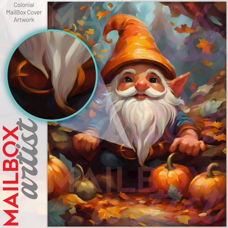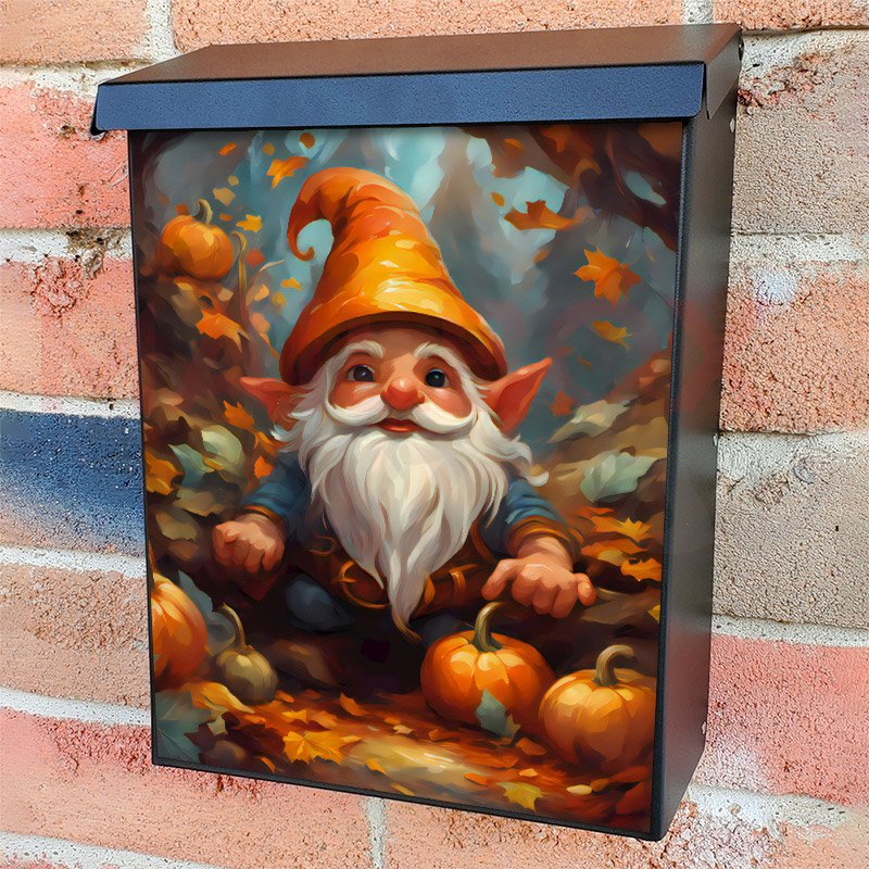 With this Cute Autumn Gnome colonial mailbox cover it’s pretty easy to convert your mailbox to a special and unique item. These covers require a flat surface, so they work with colonial mailboxes that do not have any embossed decoration or signs. Magnetic mailbox covers work with steel colonial boxes only, while self-adhesive vinyl covers are available for aluminum, plastic and steel boxes. We also offer both self-adhesive and magnetic covers with regular opaque white vinyl or reflective vinyl, which works similarly to license plates or road signs. The reflective option makes the entire cover’s surface reflective, ensuring visibility at night. In case your mailbox doesn’t work with these covers, you can purchase the preinstalled cover on a brand new mailbox as well. Also, you can create your custom colonial mailbox cover using you own pictures, adding your name, street number, etc.
