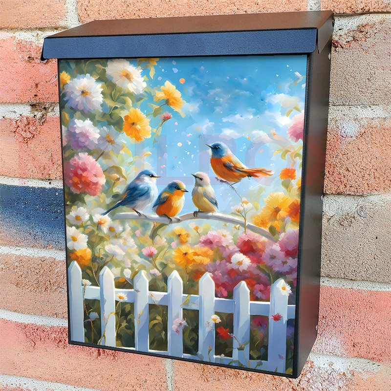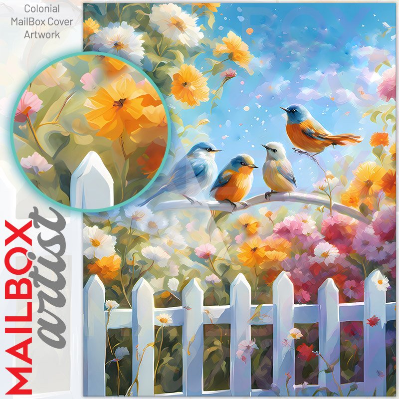 With this Cute Birds at the Cottage Garden colonial mailbox cover it’s pretty easy to convert your mailbox to a special and unique item. These covers require a flat surface, so they work with colonial mailboxes that do not have any embossed decoration or signs. Magnetic mailbox covers work with steel colonial boxes only, while self-adhesive vinyl covers are available for aluminum, plastic and steel boxes. We also offer both self-adhesive and magnetic covers with regular opaque white vinyl or reflective vinyl, which works similarly to license plates or road signs. The reflective option makes the entire cover’s surface reflective, ensuring visibility at night. In case your mailbox doesn’t work with these covers, you can purchase the preinstalled cover on a brand new mailbox as well. Also, you can create your custom colonial mailbox cover using you own pictures, adding your name, street number, etc.