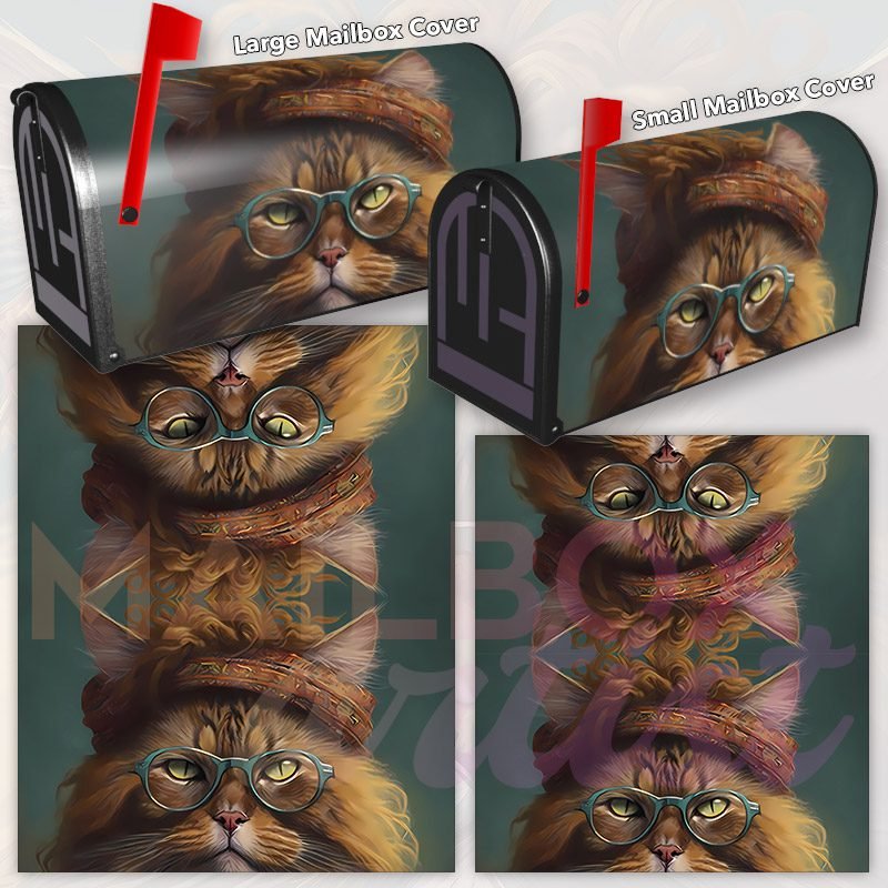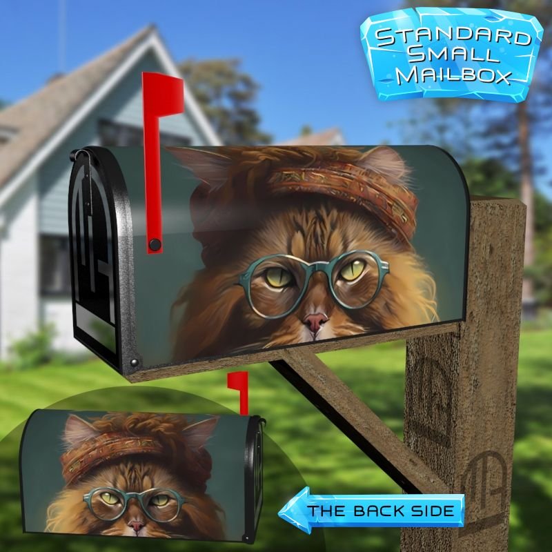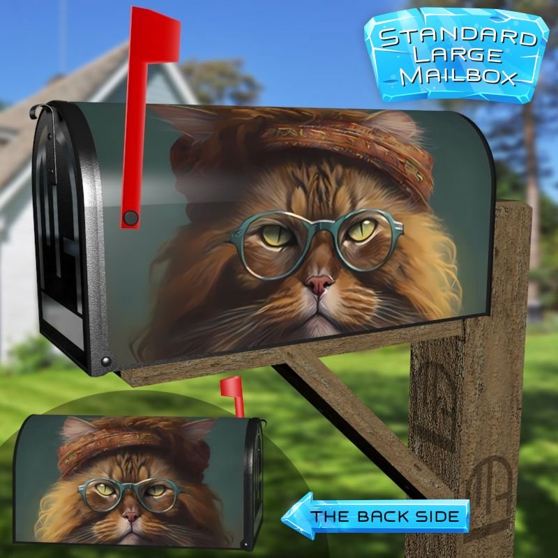 Dressing up your rural farm mailbox with the Cute Boho Hippy Cat #3 mailbox cover is an easy way to convert it into a unique and special item. These covers require a smooth surface, so they are compatible with rural farm mailboxes that do not have any embossed decorations or signs. Magnetic mailbox covers work with steel boxes only, while self-adhesive vinyl covers are available for aluminum, plastic and steel boxes. If your mailbox is not compatible with these covers, you can purchase a brand new mailbox with a preinstalled cover. Additionally, you have the option to create a custom rural farm mailbox cover with your own pictures, name, street number, etc.