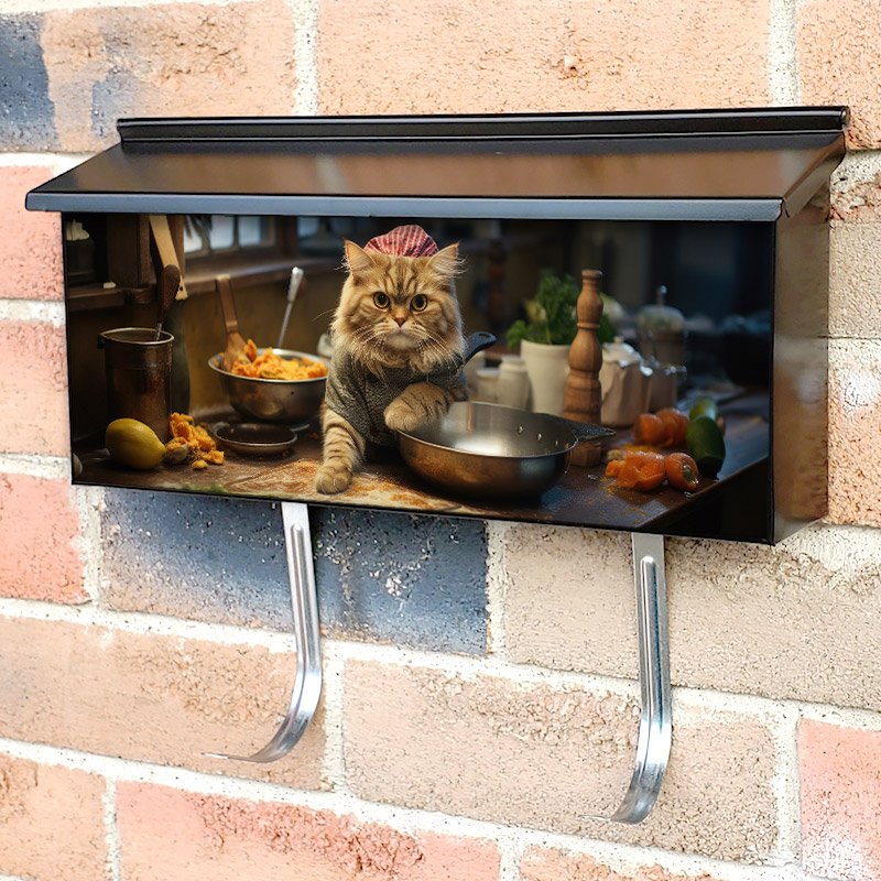 Applying your Cute Cat Prepares Food In The Kitchen townhouse / ranch mailbox cover it’s pretty easy to convert your mailbox to a special and unique item. These covers require a flat surface, so they work with townhouse / ranch mailboxes that do not have any embossed decoration or signs. Magnetic mailbox covers work with steel boxes, for aluminum and plastic boxes we offer the self-adhesive vinyl covers. In case your mailbox doesn’t work with these covers, you can purchase the preinstalled cover on a brand new mailbox as well. Also, you can create your custom townhouse / ranch mailbox cover using you own pictures, adding your name, street number, etc.