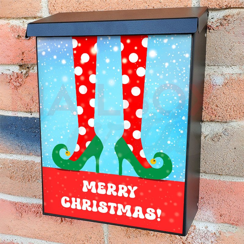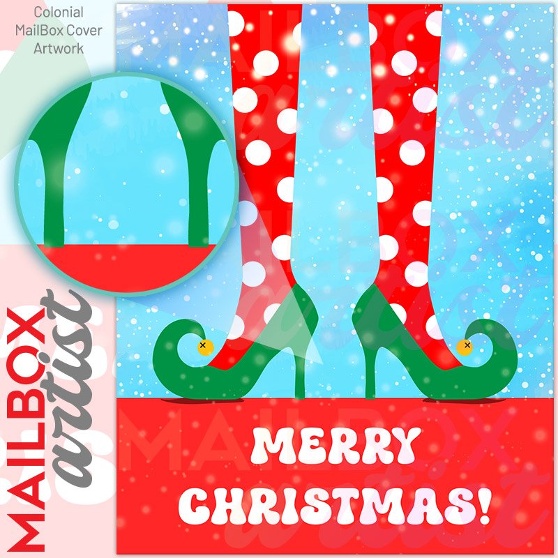 With this Cute Christmas Elf Legs 2 colonial mailbox cover it’s pretty easy to convert your mailbox to a special and unique item. These covers require a flat surface, so they work with colonial mailboxes that do not have any embossed decoration or signs. Magnetic mailbox covers work with steel colonial boxes only, while self-adhesive vinyl covers are available for aluminum, plastic and steel boxes. We also offer both self-adhesive and magnetic covers with regular opaque white vinyl or reflective vinyl, which works similarly to license plates or road signs. The reflective option makes the entire cover’s surface reflective, ensuring visibility at night. In case your mailbox doesn’t work with these covers, you can purchase the preinstalled cover on a brand new mailbox as well. Also, you can create your custom colonial mailbox cover using you own pictures, adding your name, street number, etc.