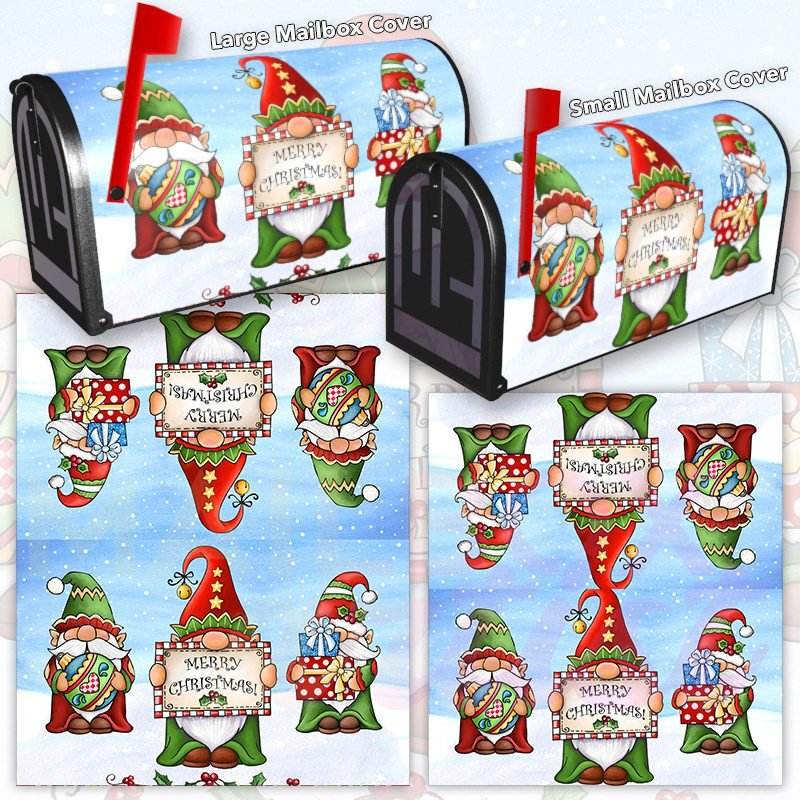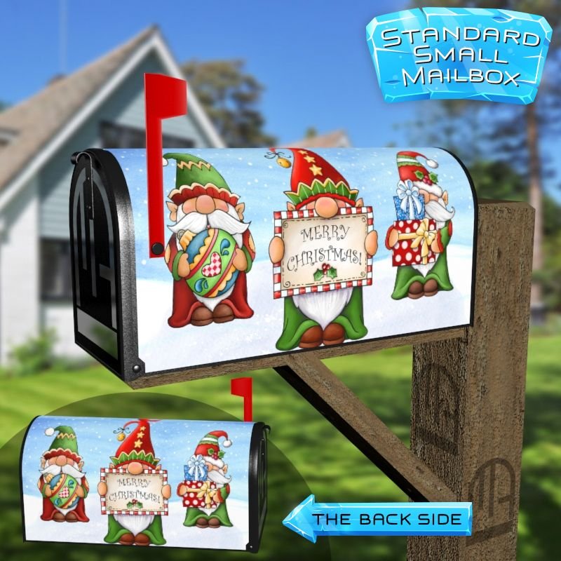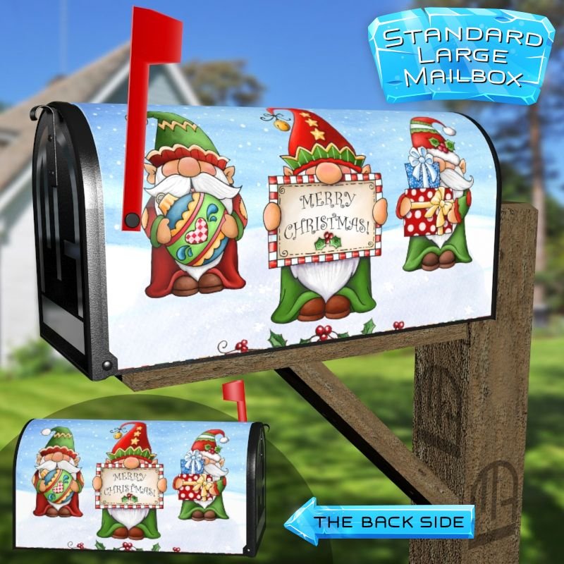 Dressing up your rural farm mailbox with the Cute Christmas Gnomes mailbox cover is an easy way to convert it into a unique and special item. These covers require a smooth surface, so they are compatible with rural farm mailboxes that do not have any embossed decorations or signs. Magnetic mailbox covers work with steel boxes only, while self-adhesive vinyl covers are available for aluminum, plastic and steel boxes. If your mailbox is not compatible with these covers, you can purchase a brand new mailbox with a preinstalled cover. Additionally, you have the option to create a custom rural farm mailbox cover with your own pictures, name, street number, etc.