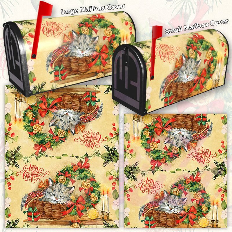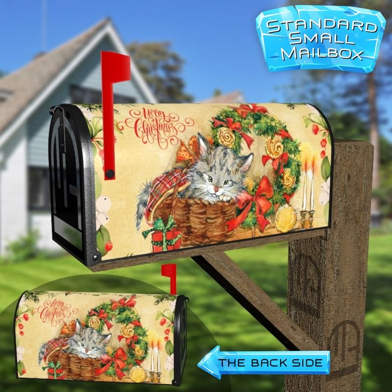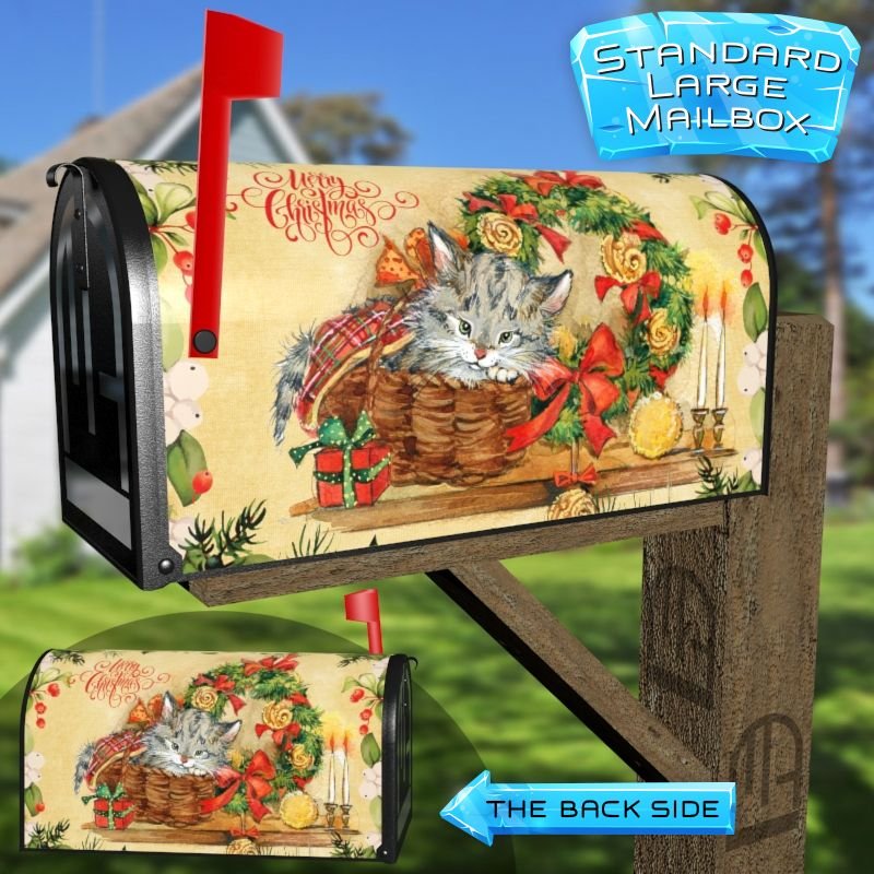 Dressing up your rural farm mailbox with the Cute Christmas Kitten and Wreath mailbox cover is an easy way to convert it into a unique and special item. These covers require a smooth surface, so they are compatible with rural farm mailboxes that do not have any embossed decorations or signs. Magnetic mailbox covers work with steel boxes only, while self-adhesive vinyl covers are available for aluminum, plastic and steel boxes. If your mailbox is not compatible with these covers, you can purchase a brand new mailbox with a preinstalled cover. Additionally, you have the option to create a custom rural farm mailbox cover with your own pictures, name, street number, etc.
